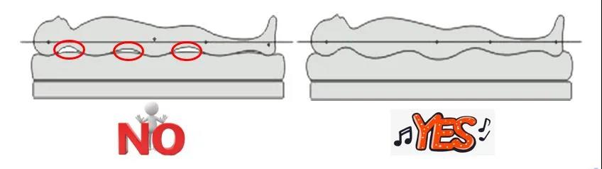 合适的床垫能使脊柱保持自然伸展,可与肩、腰、臀完全贴合,不留空隙。平躺在床垫上,伸手摸摸颈部、腰部和臀到大腿之间这三处明显弯曲的地方,看看有没有空隙。