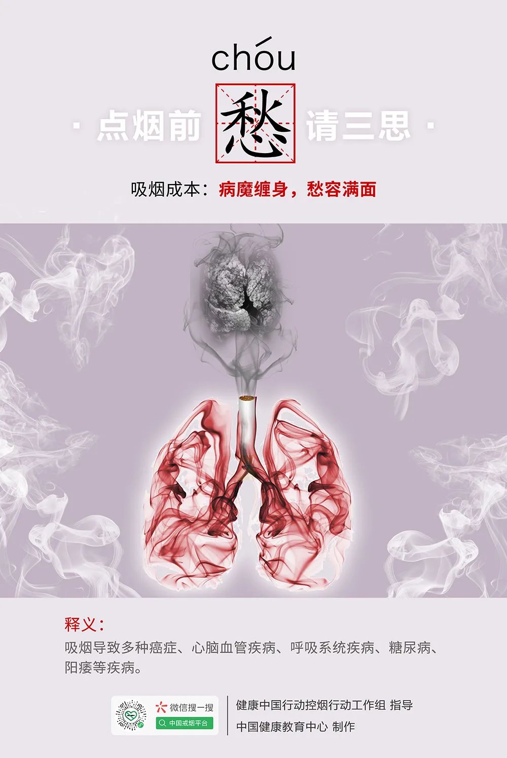 中国健康教育中心开发设计了《点烟前,请三思》系列海报,揭示吸烟的成本与代价,倡导大家积极参与控烟,主动远离烟草危害,勇于对二手烟说不,珍视身边亲人的健康和幸福,践行文明健康绿色环保的生活方式,做自己健康的第一责任人。