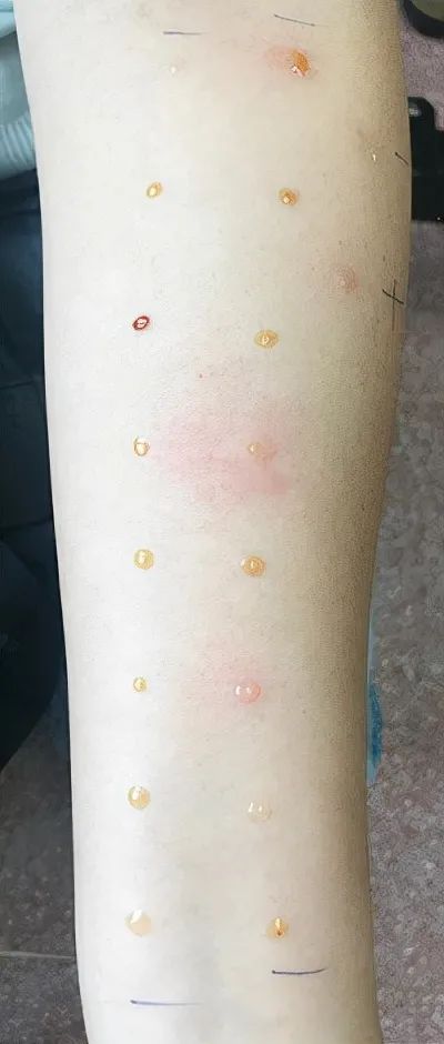 将花粉过敏原点刺液滴到前臂掌侧皮肤,再用点刺针垂直轻轻通过点刺液后刺入皮肤表层,以不引起出血为度。同时,要做生理盐水阴性对照和组胺溶液阳性对照,15分钟-20分钟后观察并记录皮肤反应。若患者对该过敏原过敏,则会在点刺部位出现类似蚊虫叮咬的风团、红晕、伪足,常伴有瘙痒。
