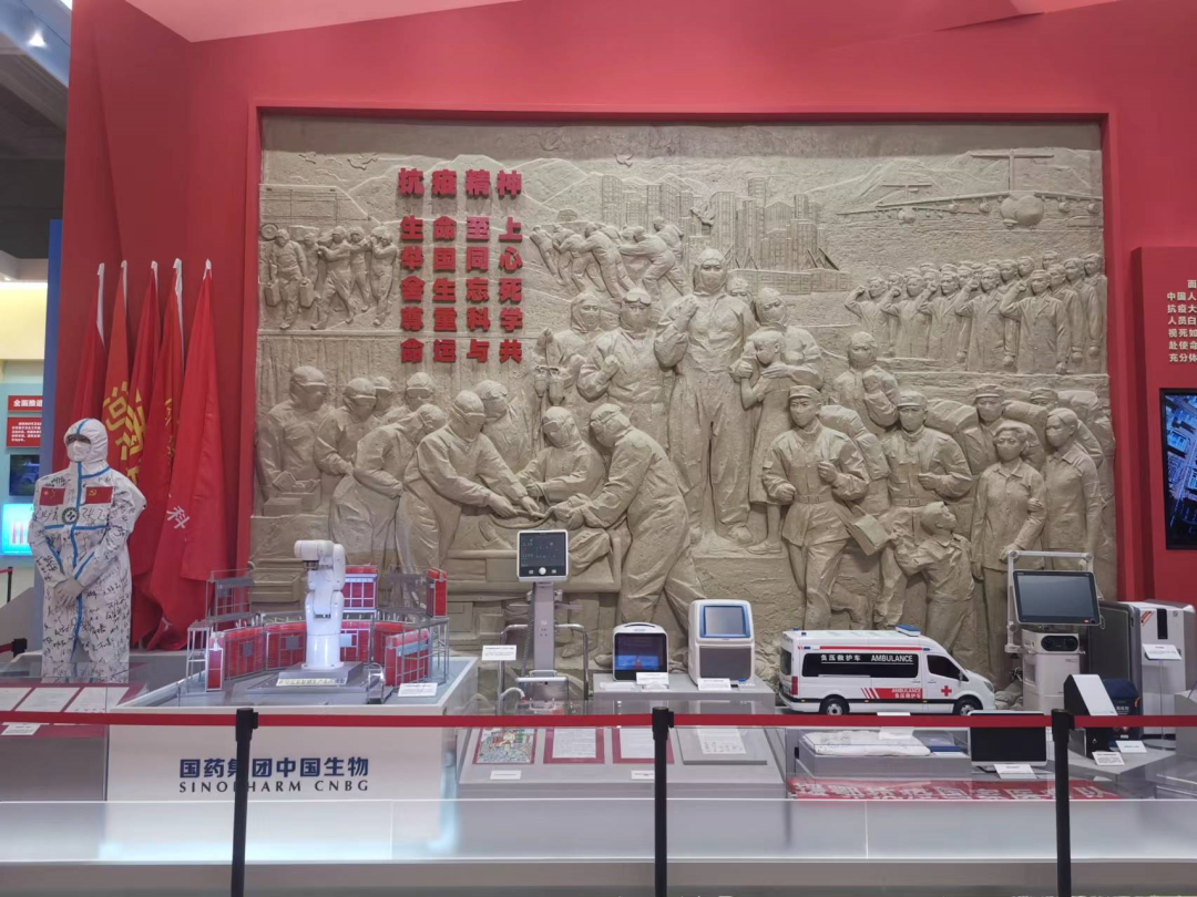 当前的幸福生活,离不开医务人员舍生忘死的奋斗;每日安定生活的底气,来自全国卫生人员筑起牢固屏障。在抗击新冠肺炎疫情单元,一个身着全套防护装备的人物像傲然屹立,防护服上印着党旗、国旗,写满冲在抗疫一线人员的名字。在人物像的旁边,我国新冠疫苗智慧生产车间模型、负压救护车模型、荧光免疫层析分析仪、数字PCR仪器及试剂盒、无人自动配送车等展品,同医务人员亲笔书写的“抗疫请愿书”“请战书”一道,簇拥着“生命至上、举国同心、舍生忘死、尊重科学、命运与共”抗疫精神大型浮雕。