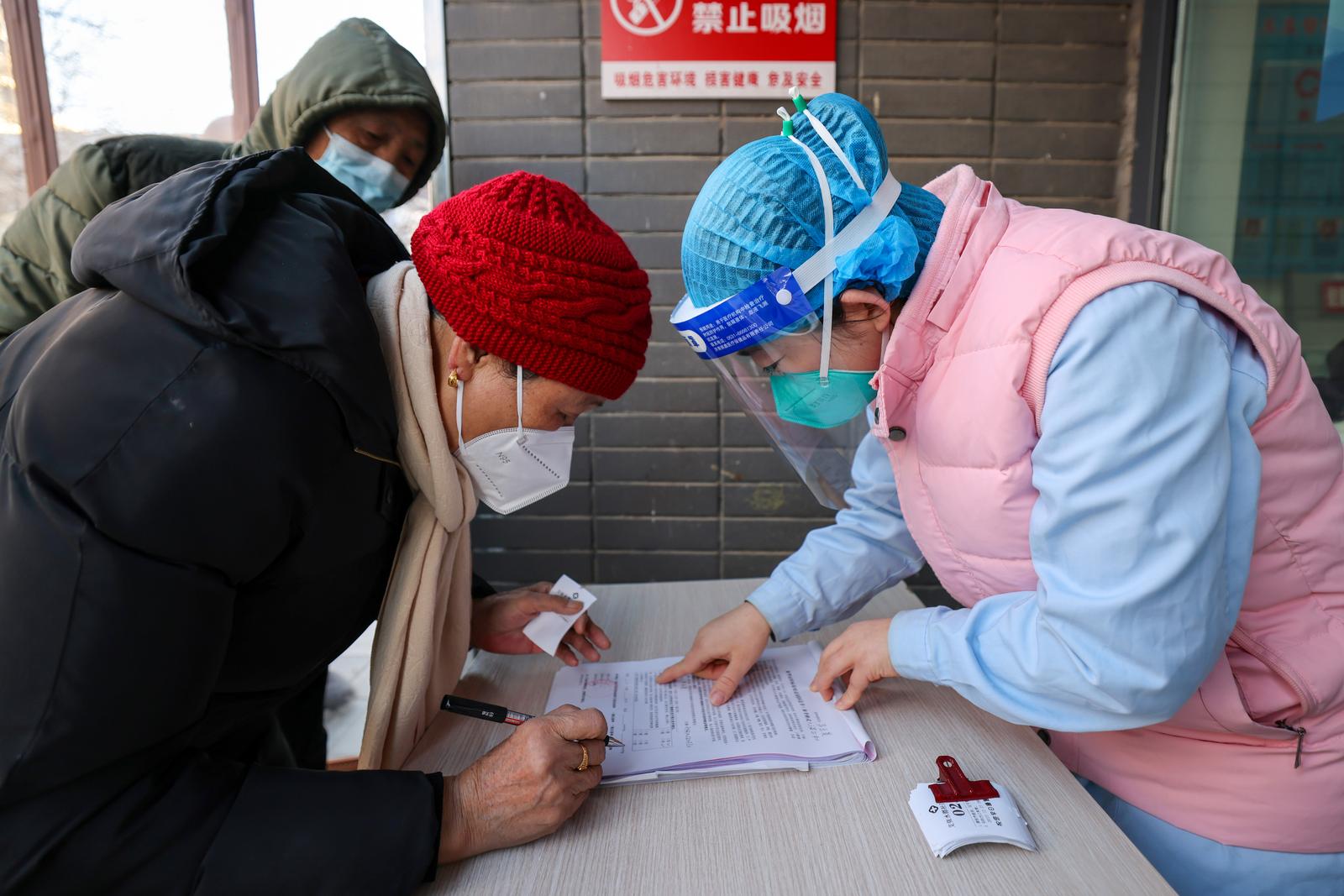 市民在社区工作人员的指导下填写疫苗接种知情同意书。