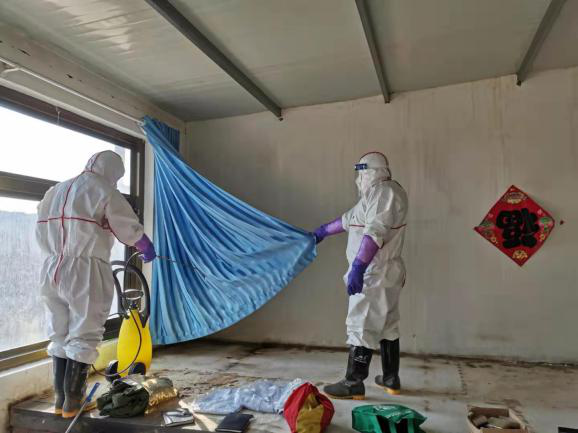 消毒组仅有两名同志,他们为红寺堡区第一例确诊患者蔡某家里进行了终末消毒。他们时刻准备着为流调组和采样组进行消毒,他们穿着密不透气的隔离衣,背着装满消毒液的喷雾器,给采样组、流调组消毒时被淋湿的衣服,天气虽然寒冷,但是,他们绝不退缩。除此之外他们还为隔离点、卡点等进行消毒剂的配比及使用情况、现场防护措施和现场消杀指导与消毒宣传。