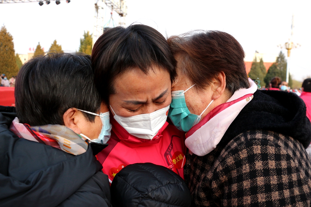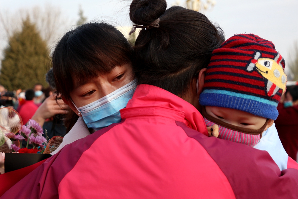 花马广场上,英雄们的亲属同事朋友,早早等候着,有的丈夫抱着一岁一个月的孩子等待与妻子团聚,有的母亲带着五六岁的孙子接女儿回家。侯娜的女儿自豪地说:“我妈妈是大英雄,我特别喜欢她。”旁边等候的英雄唐丹的儿子听到了不甘示弱,立马大声喊:“我妈妈也是英雄。”