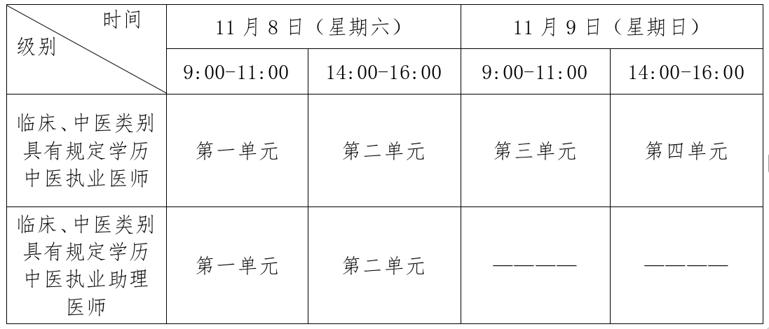 执业医师资格考试考试时间为2025年11月8日9:00-11:00、14:00-16:00,11月9日9:00-11:00、14:00-16:00。共计4个单元。