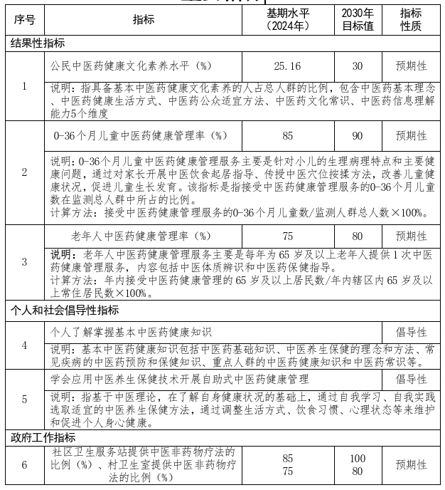 到2030年,全区居民中医药健康文化素养水平达30%;二级以上公立综合医院和三级妇幼保健院设置中医临床科室的比例达100%;社区卫生服务站、村卫生室提供中医非药物疗法的比例分别达100%、80%;老年人中医药健康管理率达85%,0-36个月儿童中医药健康管理率稳步在90%以上。