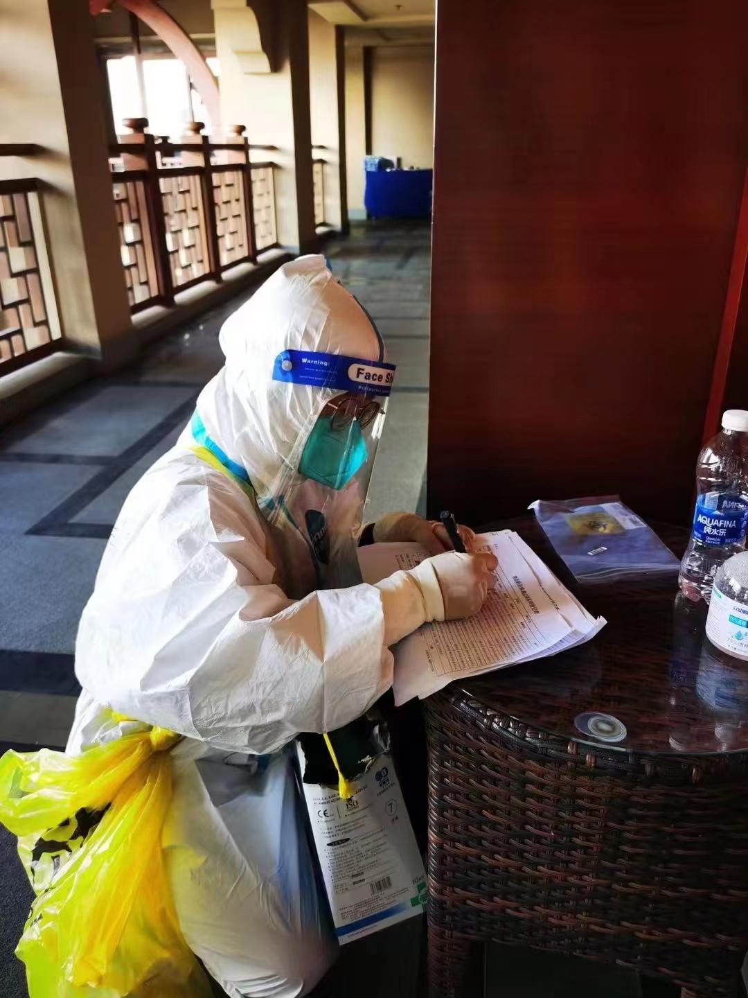 王凯告诉记者,每个班次进舱工作4个小时,期间完全没有休息时间,不断有病人询问病情,他的任务就是写好医疗文书记录,做好诊断工作。在工作中,他积极发挥自身特长,一面观察病人,为患者提供力所能及的帮助,即使是患者所需的一个指甲刀、一个掏耳勺,他也想尽办法协调物资组带给患者;另一方面,他随时观察队员入舱后遇到的各种困难和问题,并及时梳理,向医疗队负责人汇报,为队员们下次入舱时做好准备。