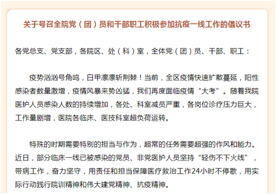 党政工团形成救治合力。医院党委向全院职工发出倡议书,明确救治工作全院一盘棋,积极发扬伟大抗疫精神和崇高职业精神,全院做到统一思想、齐心协力,克服困难、稳妥有序,尽快将重症患者收治入院,给予及时有效的治疗和照护,切实提高重症抢救成功率。