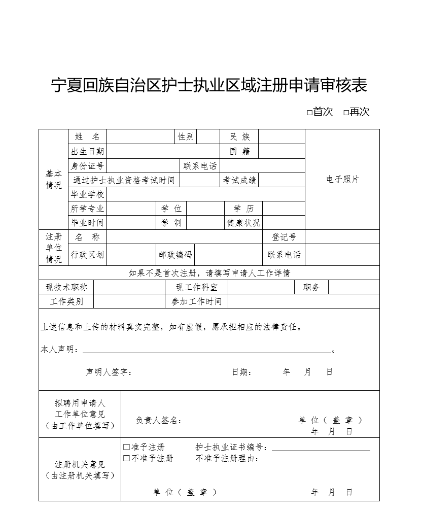 第七条 申请护士区域注册,在宁夏政务服务网上进行申报并填写《宁夏回族自治区护士执业区域注册申请审核表》(见附件1),上传申请人临床护理培训并考核合格的证明、正面免冠彩色2寸近照、护士执业资格考试成绩合格证明。
