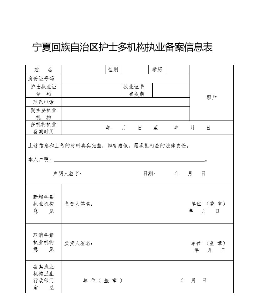 第八条 申请护士执业备案,在宁夏政务服务网上进行申报并填写《宁夏回族自治区护士多机构执业备案信息表》(见附件2),上传拟执业机构聘用合同或协议(应注明聘用时间)。申请护士执业备案取消的填写《宁夏回族自治区护士多机构执业备案信息表》(见附件2)。