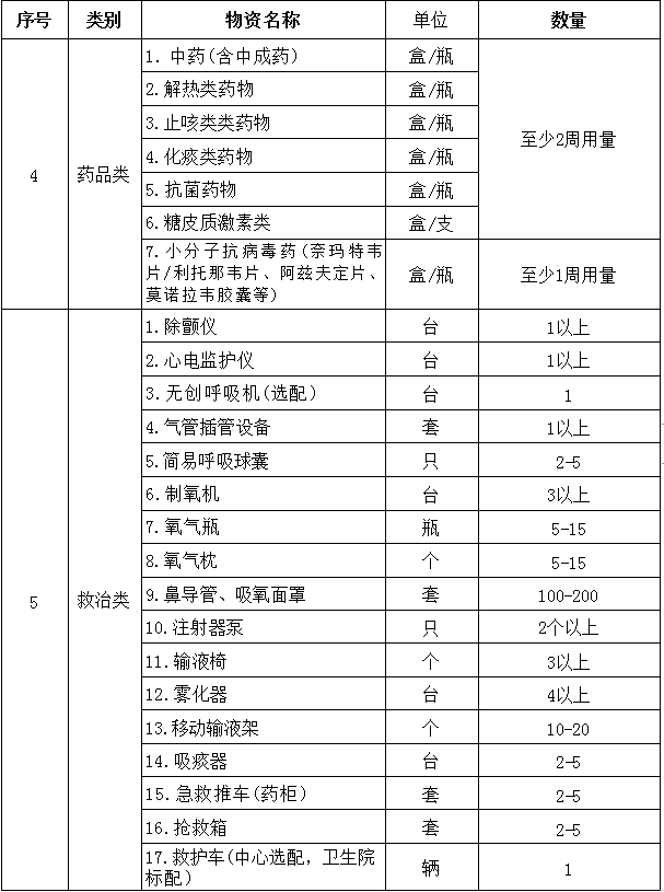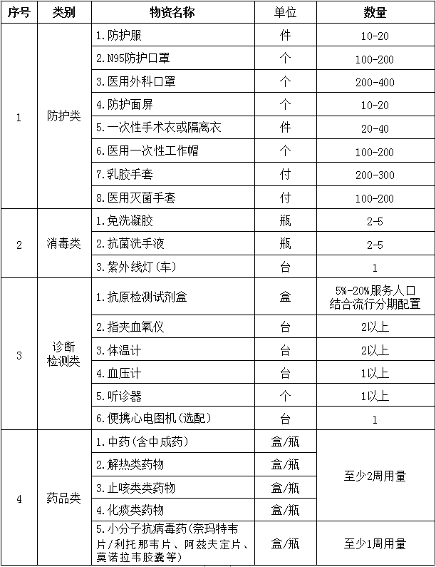 注:消耗品、对症治疗药品根据使用情况动态配备,确保可用量始终保持在2周以上。抗原检测试剂、小分子药物配备根据实际情况酌情调整。