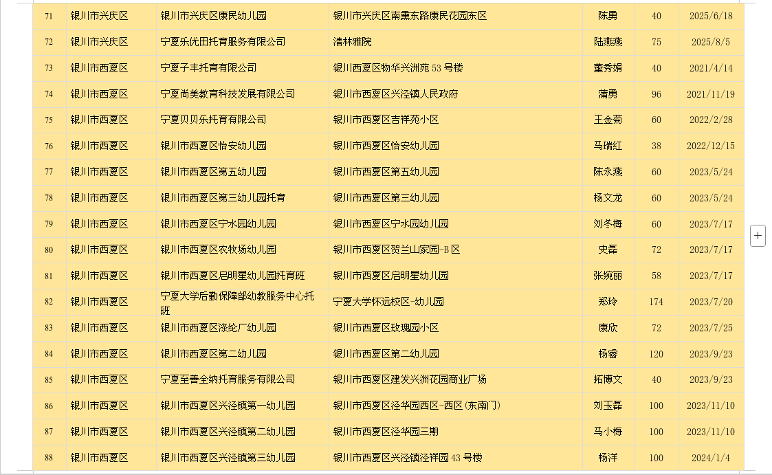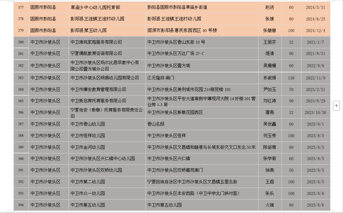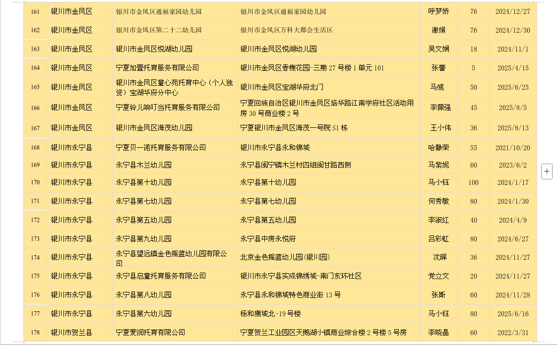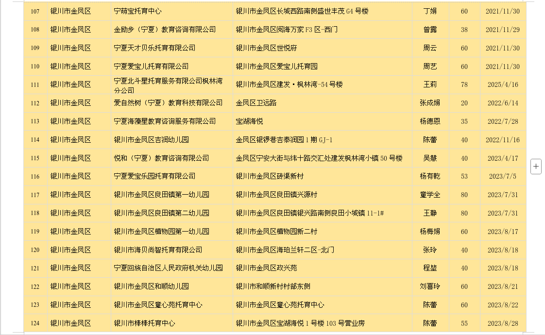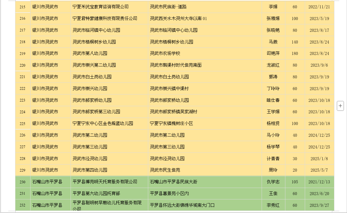 为加强托育机构管理,根据《自治区健康宁夏建设领导小组关于促进3岁以下婴幼儿照护服务发展的实施意见》(宁健组发〔2020〕3号)、《关于印发宁夏回族自治区托育机构登记和备案实施细则(试行)的通知》(宁卫规发〔2022〕2号)要求,宁夏回族自治区实行3岁以下婴幼儿托育机构备案管理制度,现将机构名单及主要信息面向社会公开。