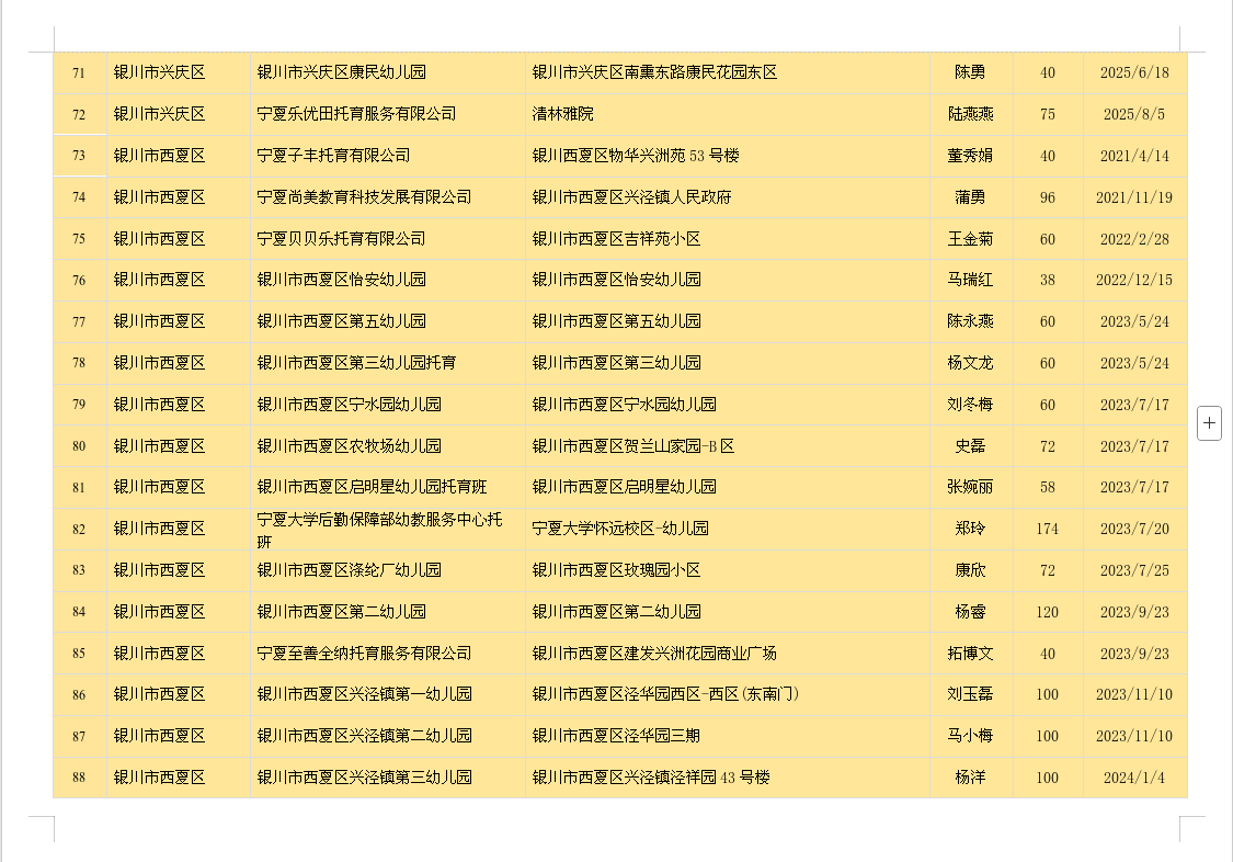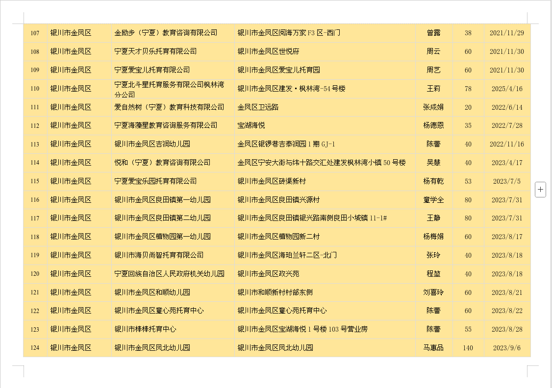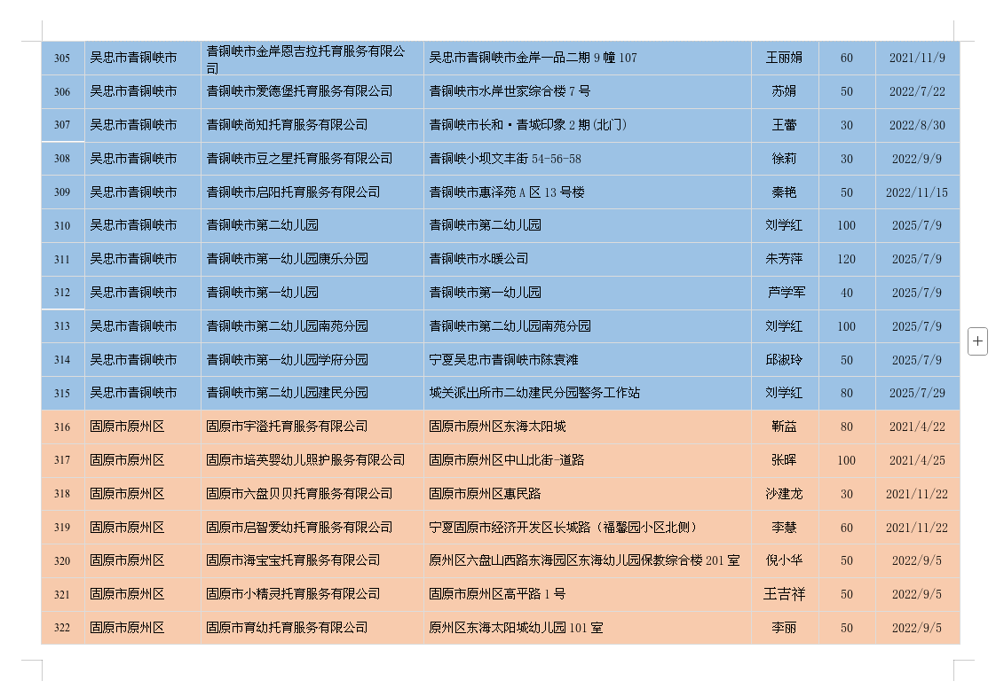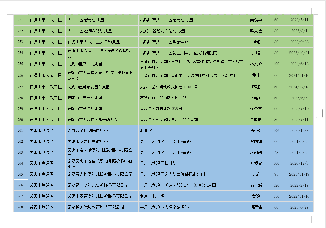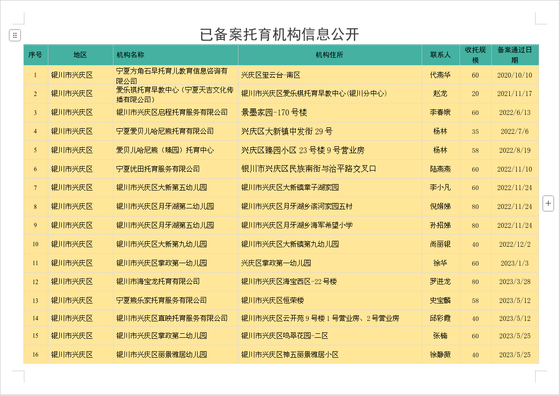 为加强托育机构管理,根据《自治区健康宁夏建设领导小组关于促进3岁以下婴幼儿照护服务发展的实施意见》(宁健组发〔2020〕3号)、《关于印发宁夏回族自治区托育机构登记和备案实施细则(试行)的通知》(宁卫规发〔2022〕2号)要求,宁夏回族自治区实行3岁以下婴幼儿托育机构备案管理制度,现将机构名单及主要信息面向社会公开。