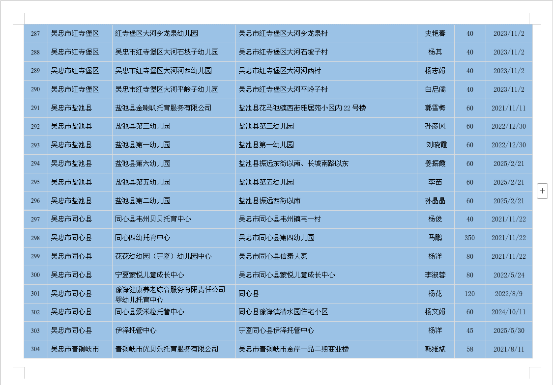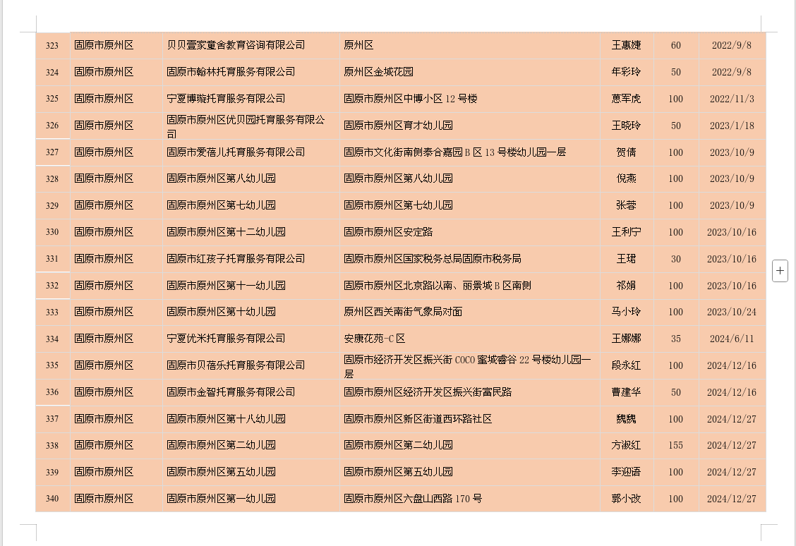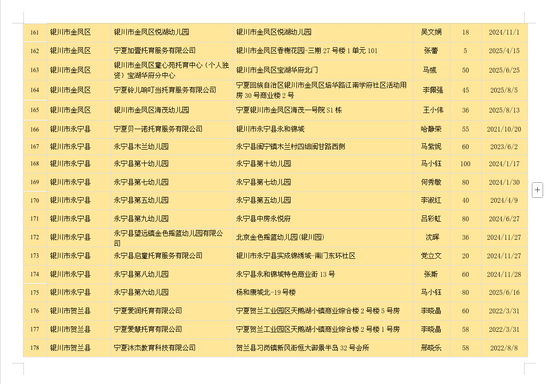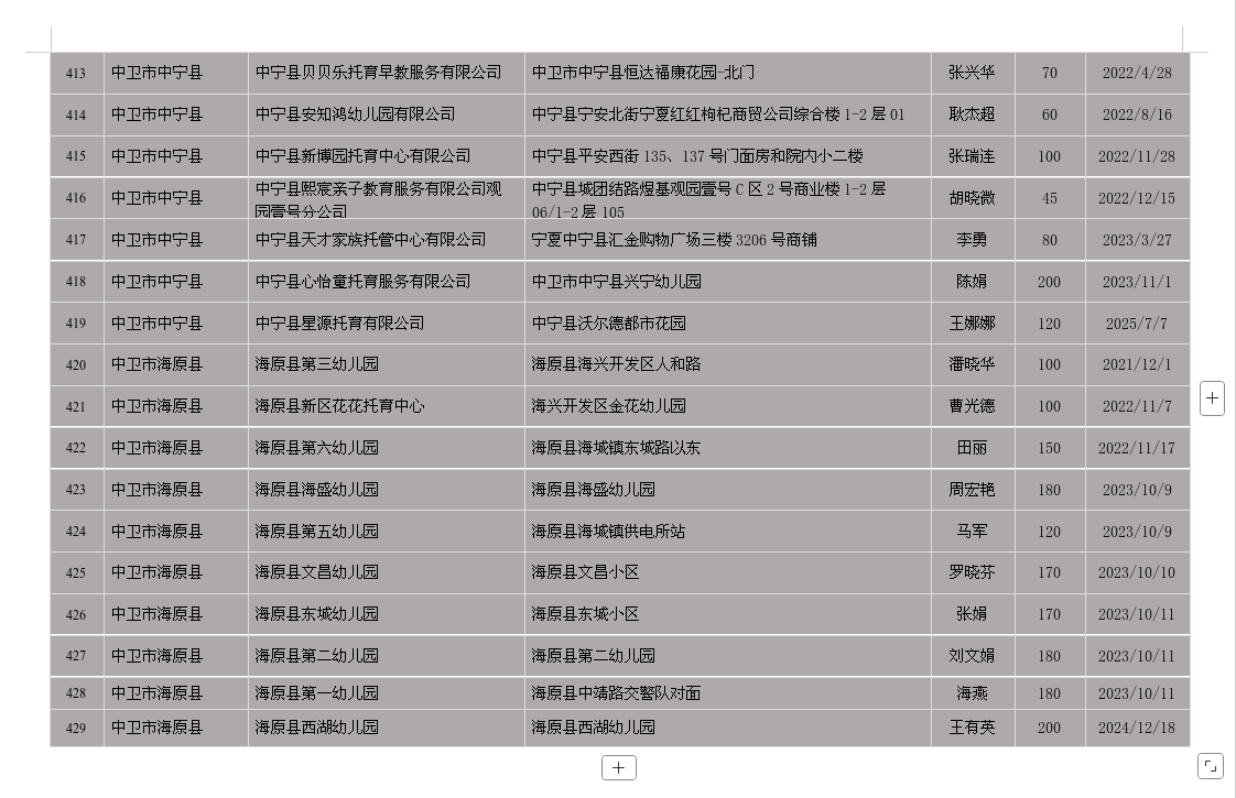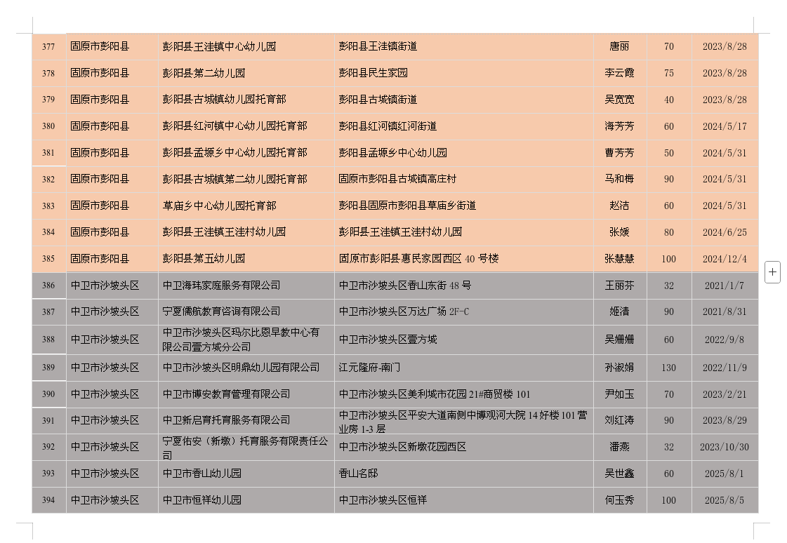 为加强托育机构管理,根据《自治区健康宁夏建设领导小组关于促进3岁以下婴幼儿照护服务发展的实施意见》(宁健组发〔2020〕3号)、《关于印发宁夏回族自治区托育机构登记和备案实施细则(试行)的通知》(宁卫规发〔2022〕2号)要求,宁夏回族自治区实行3岁以下婴幼儿托育机构备案管理制度,现将机构名单及主要信息面向社会公开。