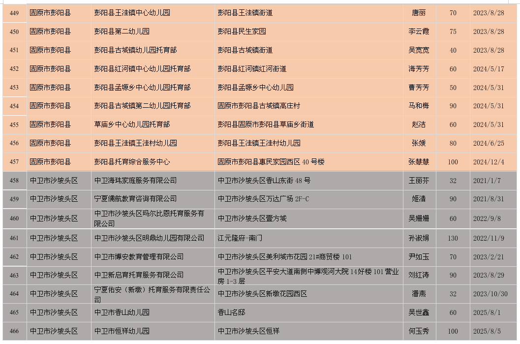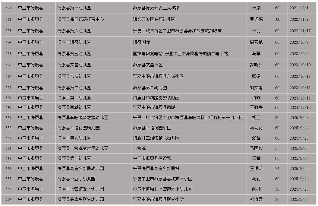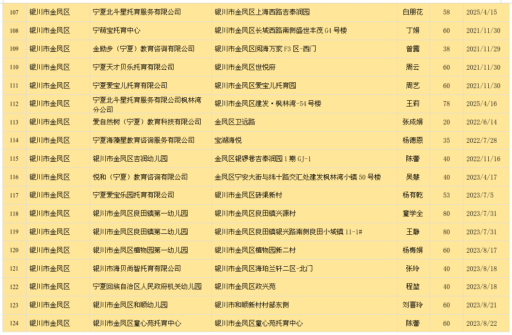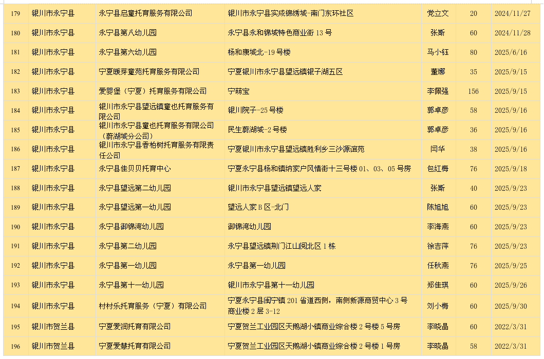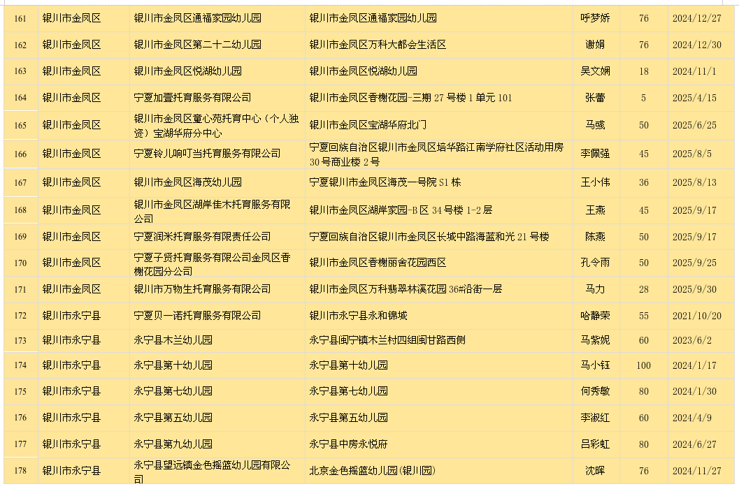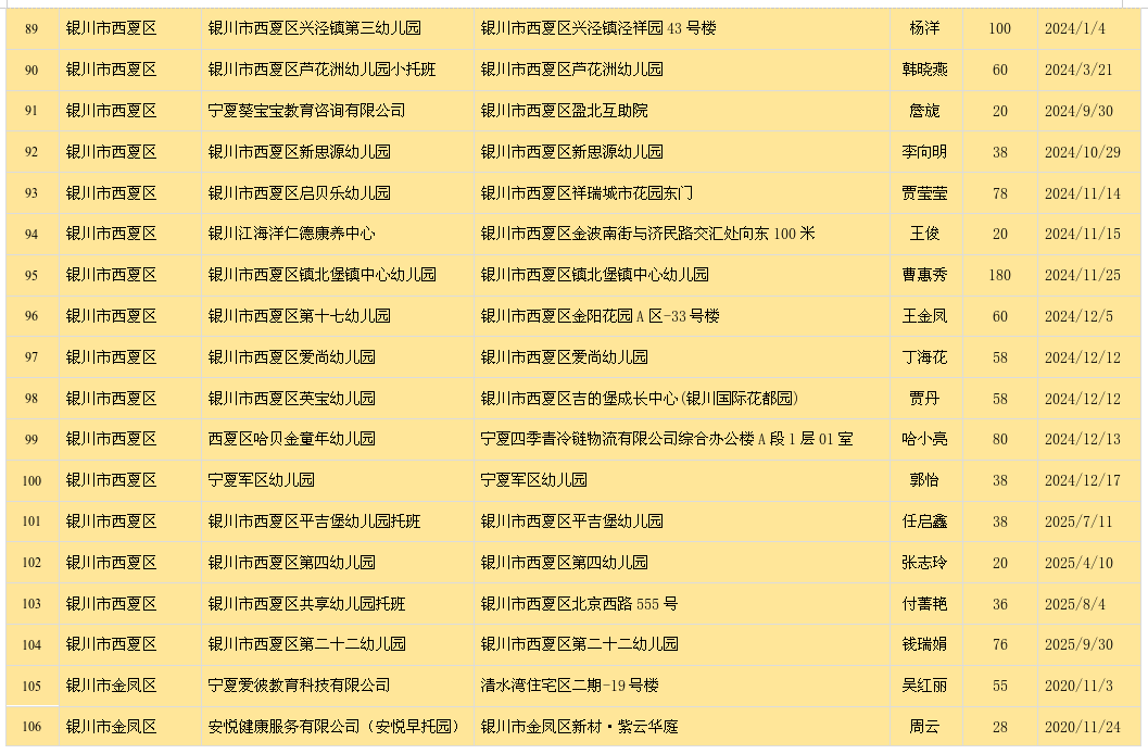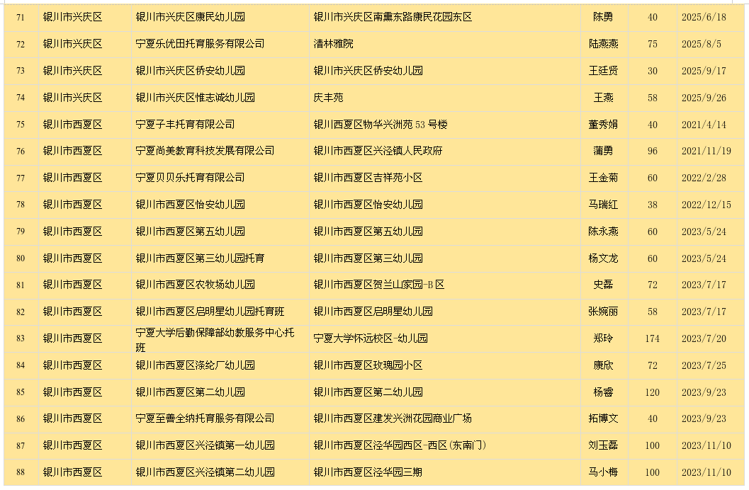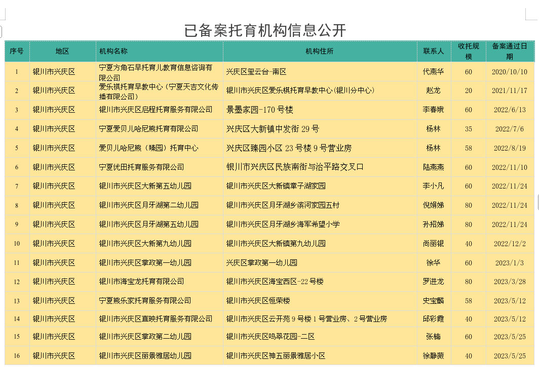 为加强托育机构管理,根据《自治区健康宁夏建设领导小组关于促进3岁以下婴幼儿照护服务发展的实施意见》(宁健组发〔2020〕3号)、《关于印发宁夏回族自治区托育机构登记和备案实施细则(试行)的通知》(宁卫规发〔2022〕2号)要求,宁夏回族自治区实行3岁以下婴幼儿托育机构备案管理制度,现将机构名单及主要信息面向社会公开。