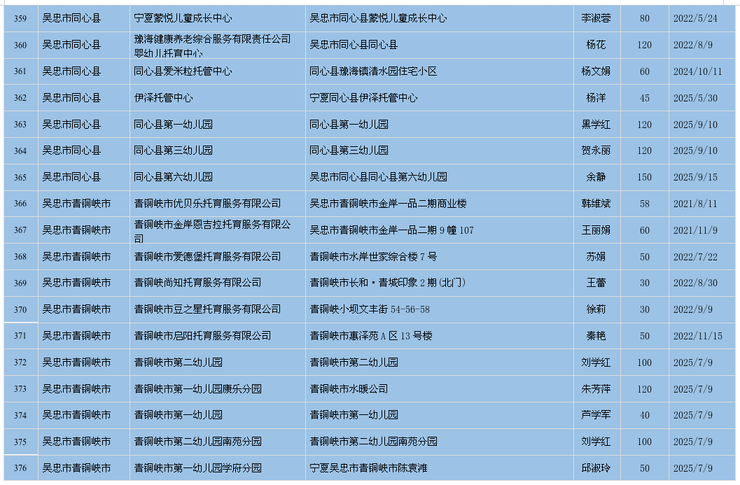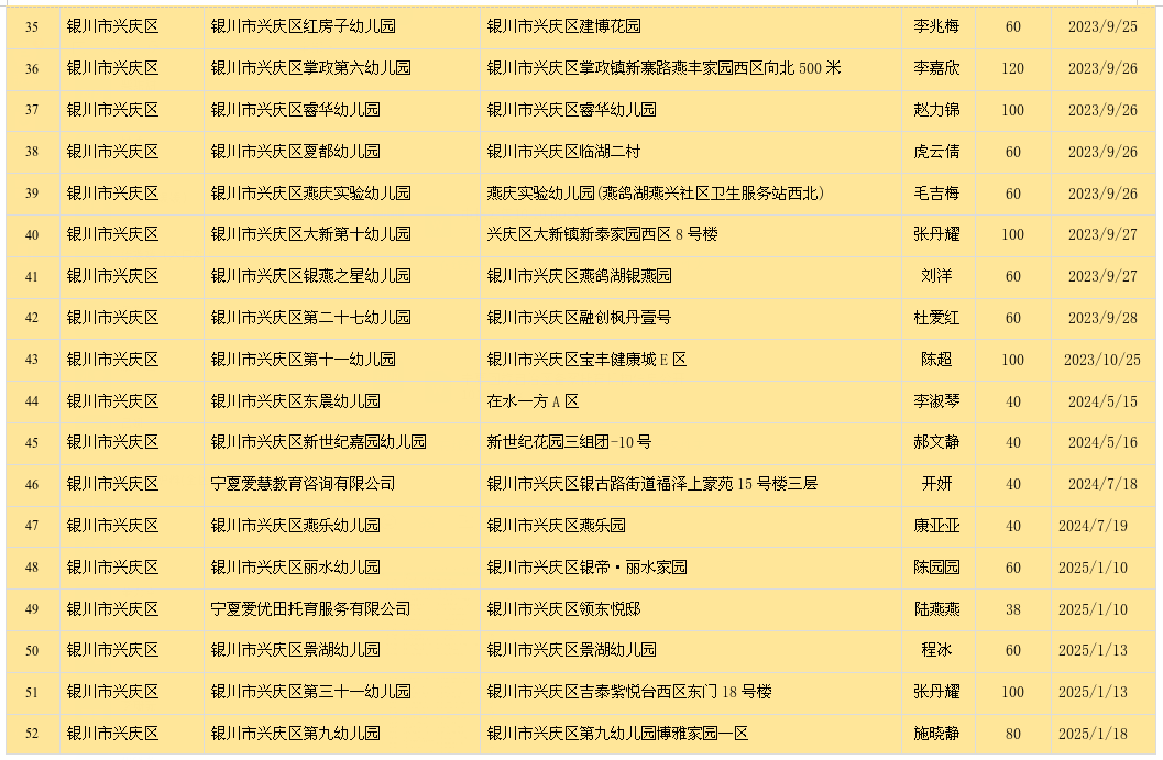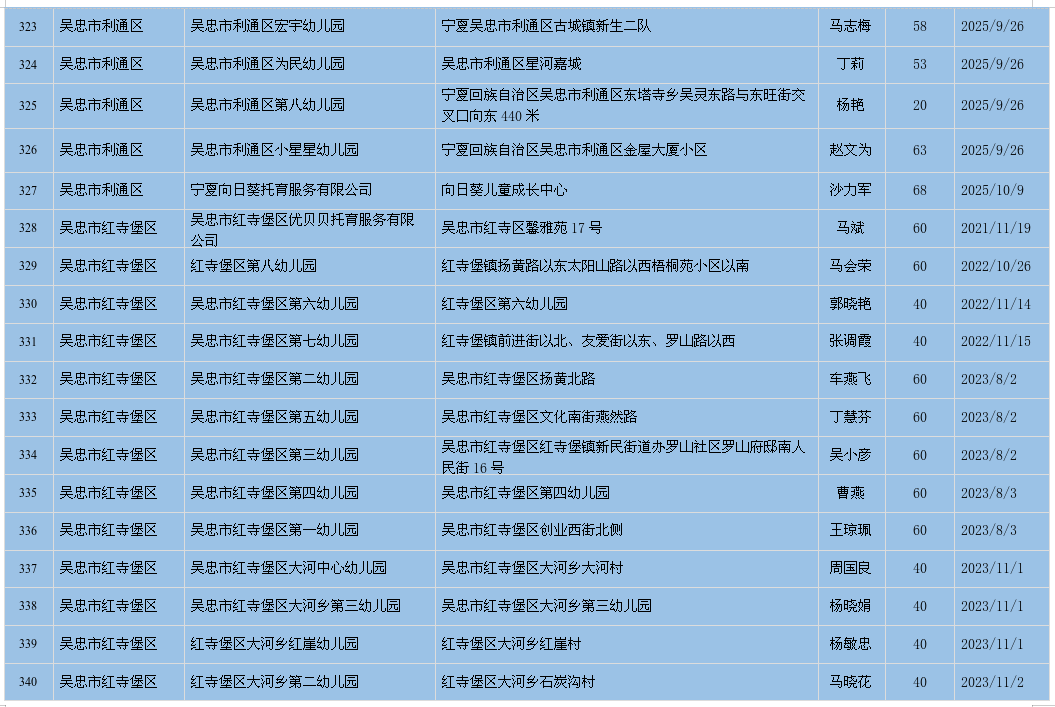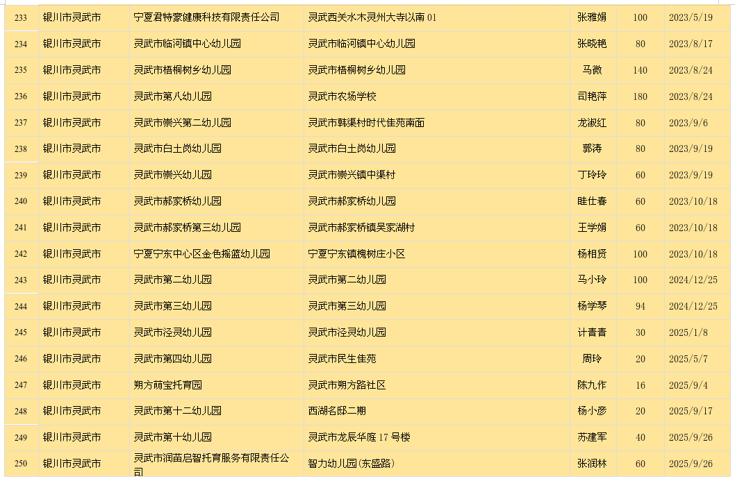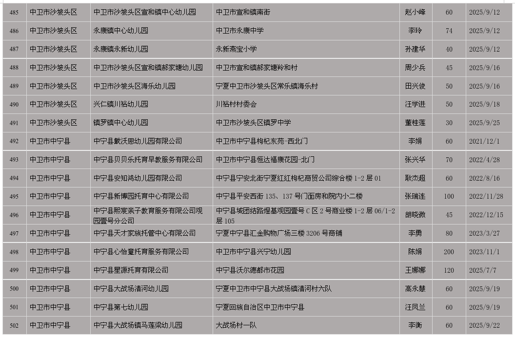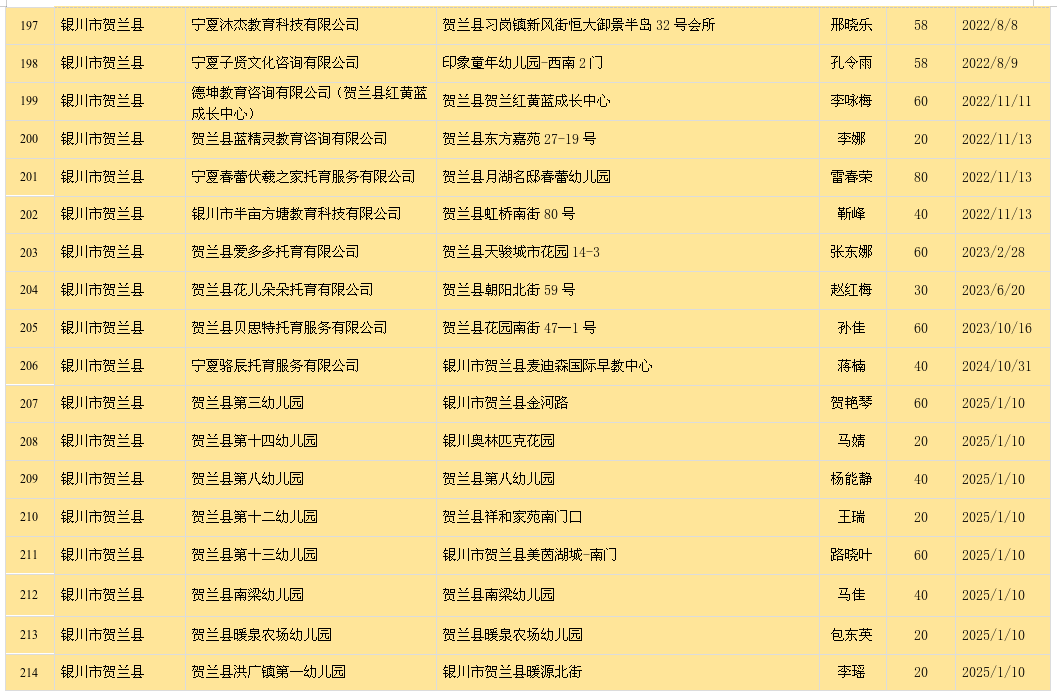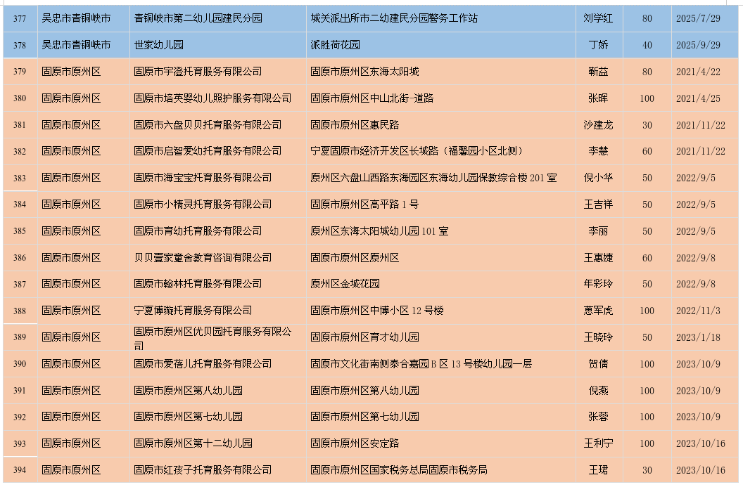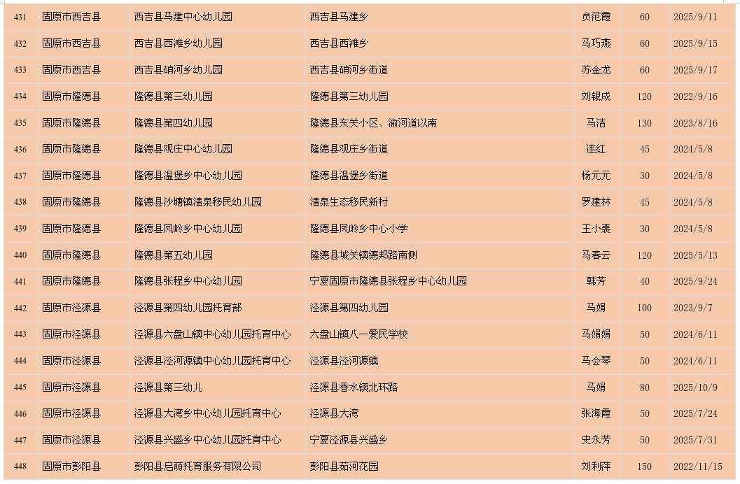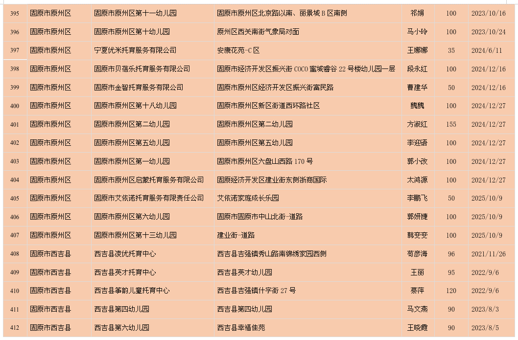 为加强托育机构管理,根据《自治区健康宁夏建设领导小组关于促进3岁以下婴幼儿照护服务发展的实施意见》(宁健组发〔2020〕3号)、《关于印发宁夏回族自治区托育机构登记和备案实施细则(试行)的通知》(宁卫规发〔2022〕2号)要求,宁夏回族自治区实行3岁以下婴幼儿托育机构备案管理制度,现将机构名单及主要信息面向社会公开。