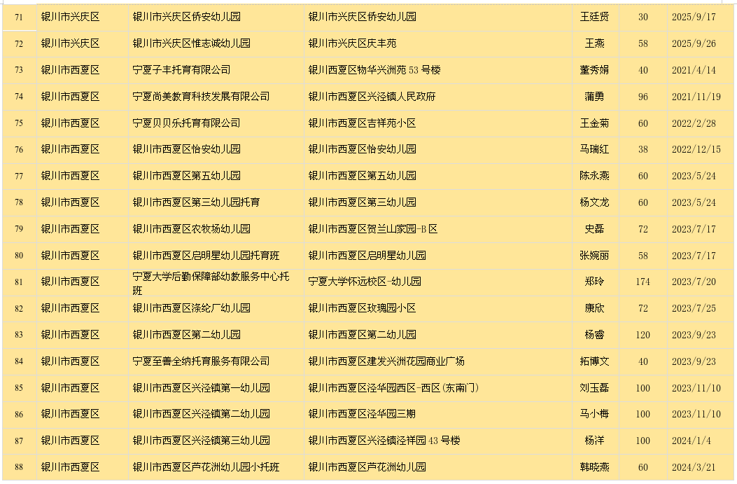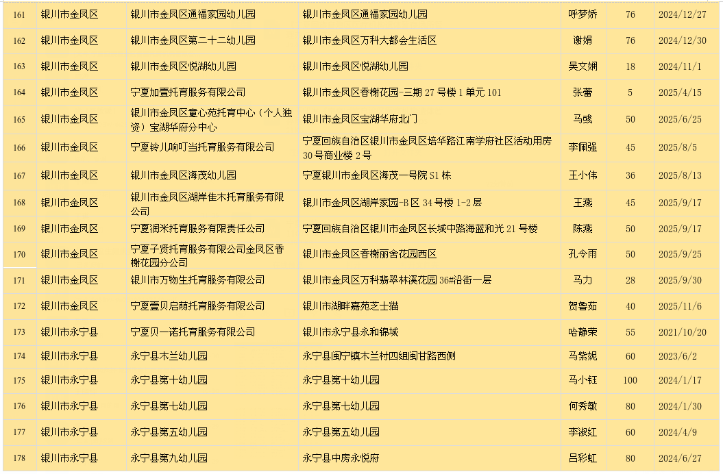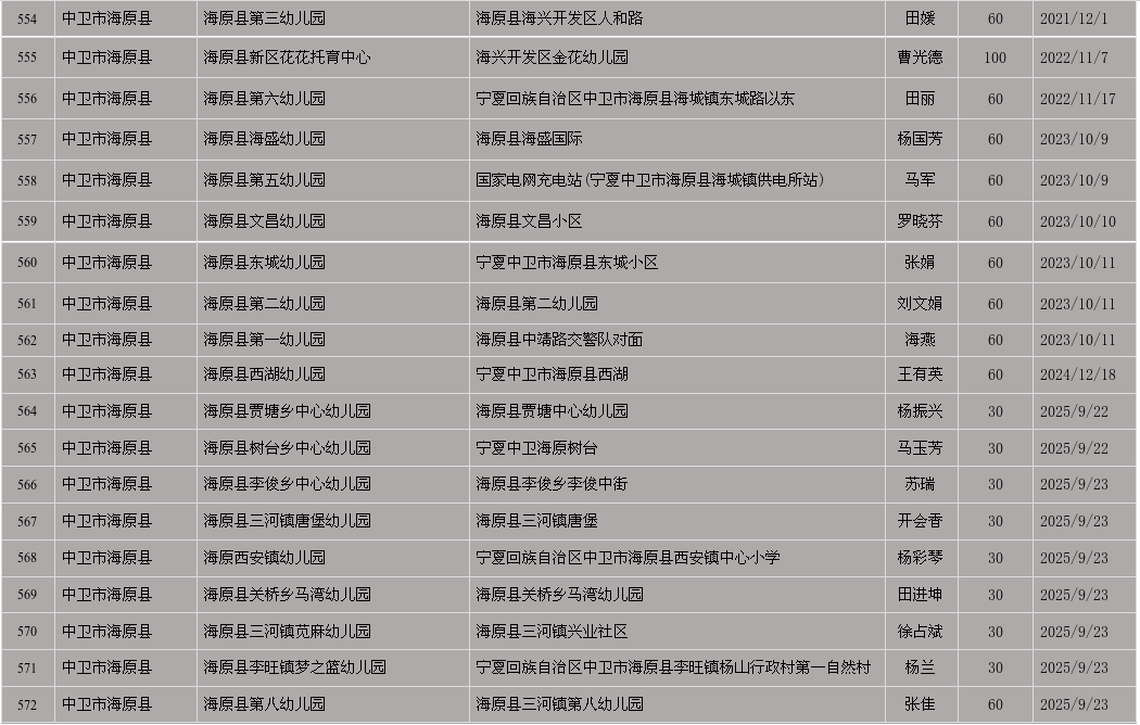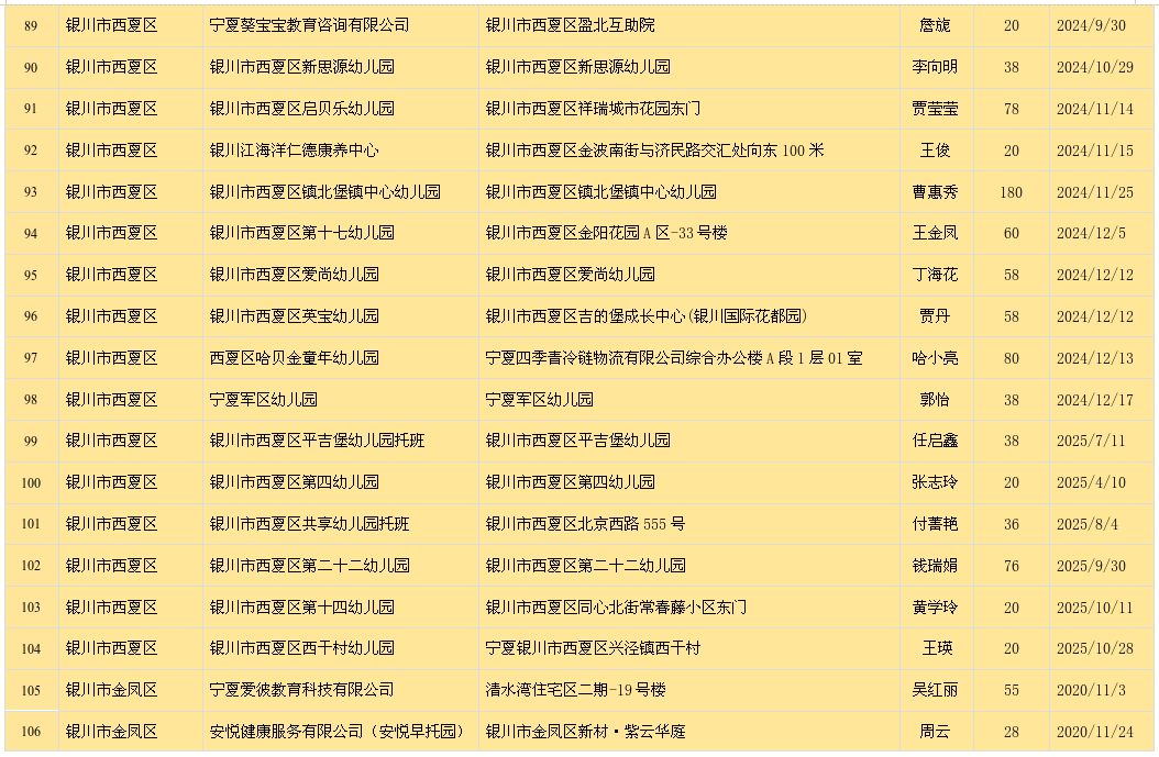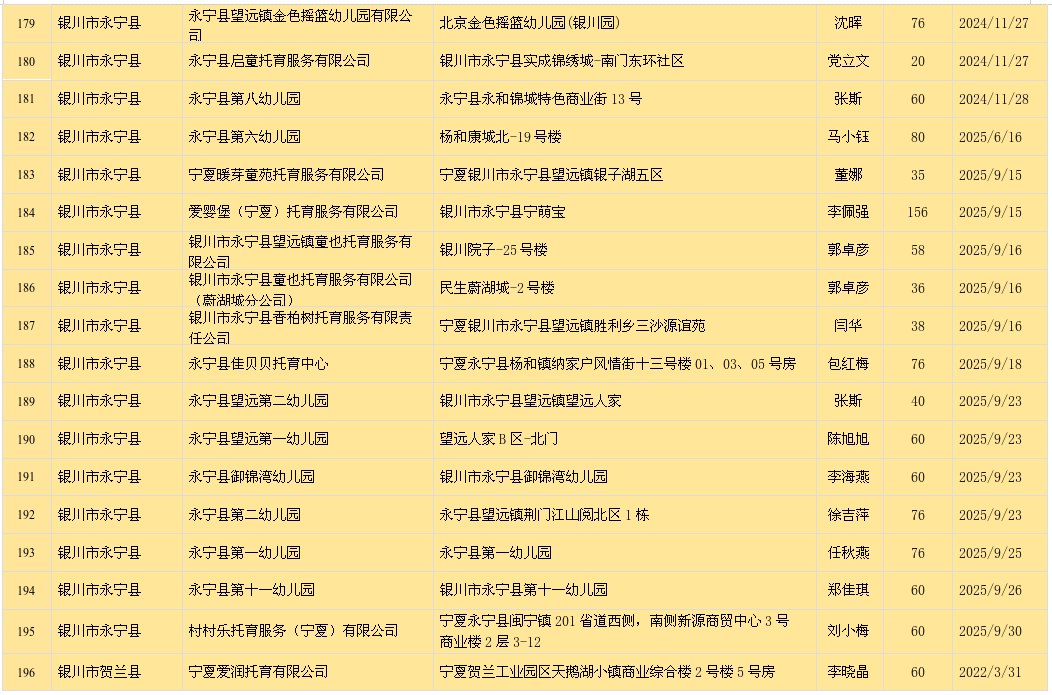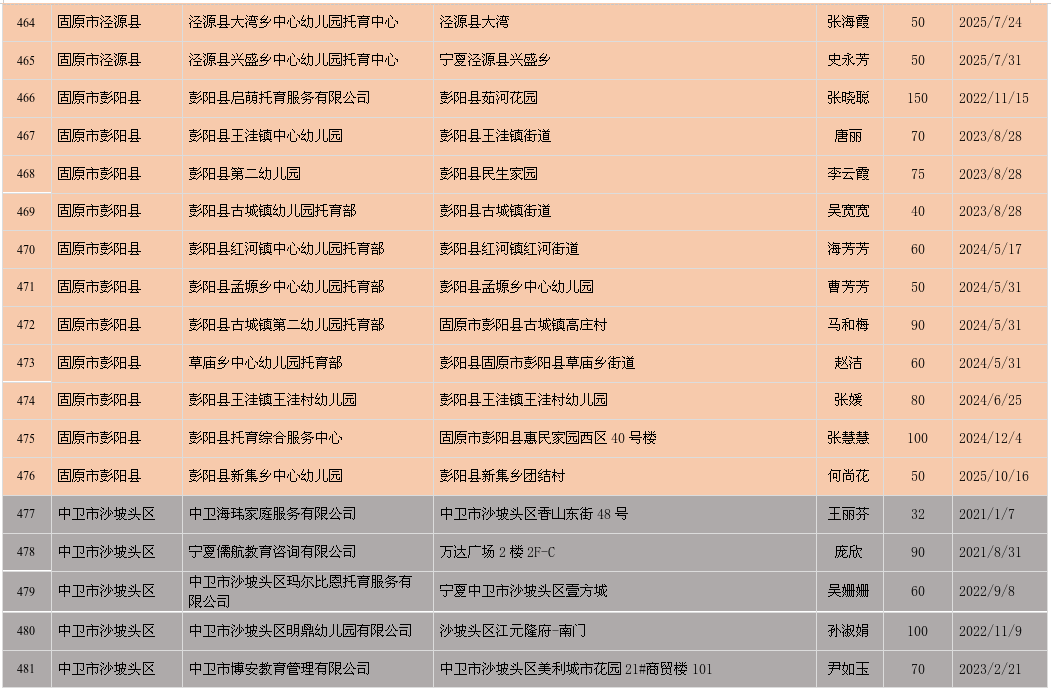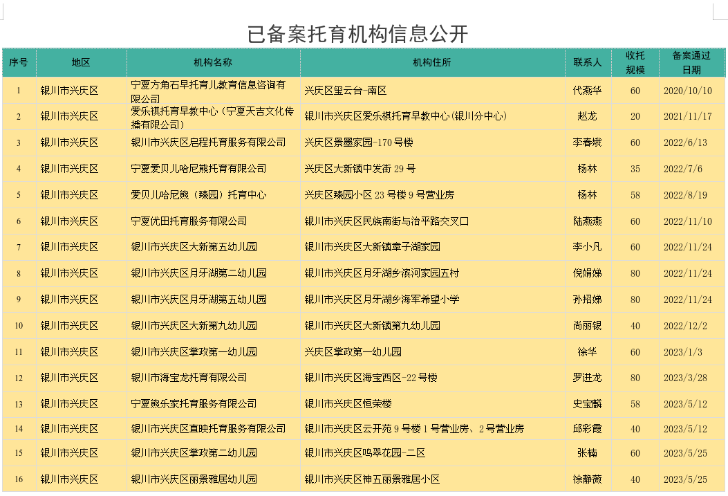 为加强托育机构管理,根据《自治区健康宁夏建设领导小组关于促进3岁以下婴幼儿照护服务发展的实施意见》(宁健组发〔2020〕3号)、《关于印发宁夏回族自治区托育机构登记和备案实施细则(试行)的通知》(宁卫规发〔2022〕2号)要求,宁夏回族自治区实行3岁以下婴幼儿托育机构备案管理制度,现将机构名单及主要信息面向社会公开。