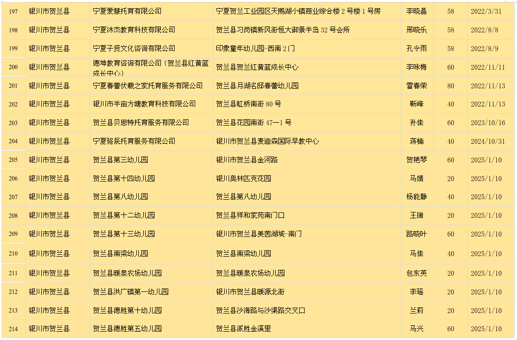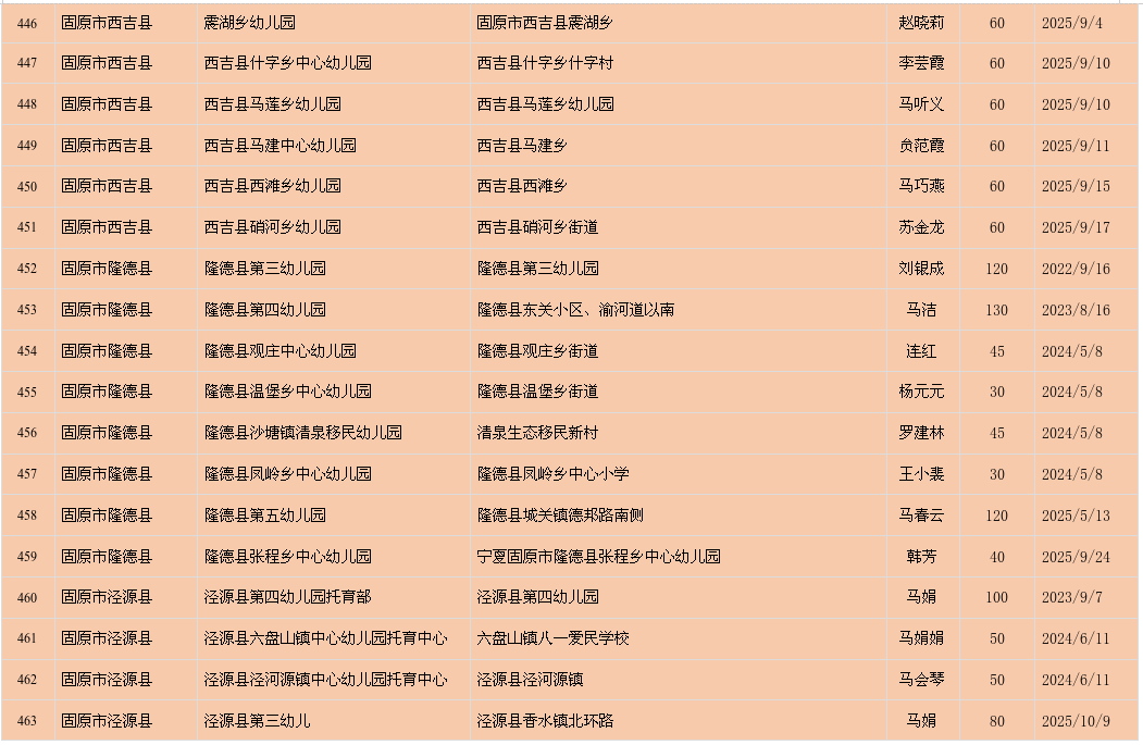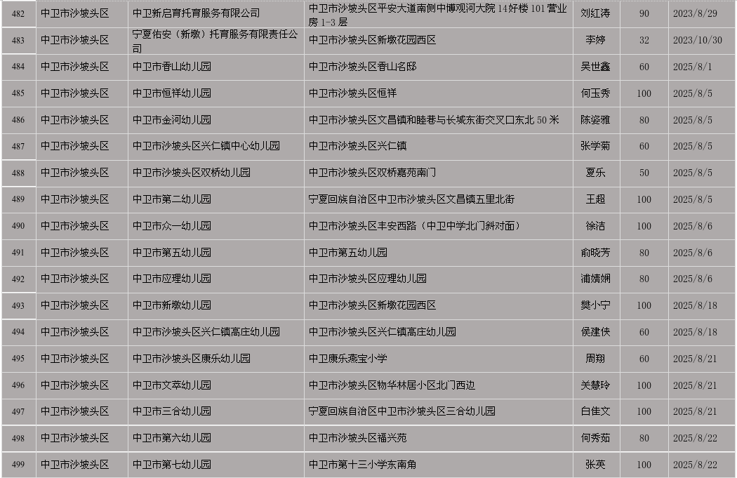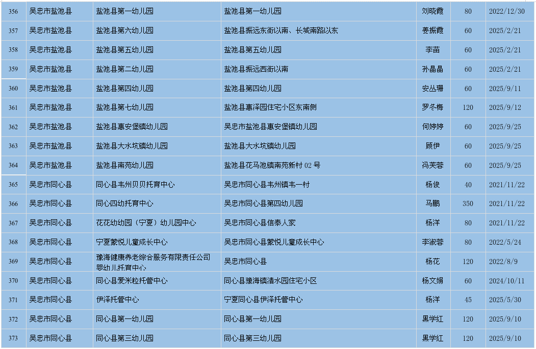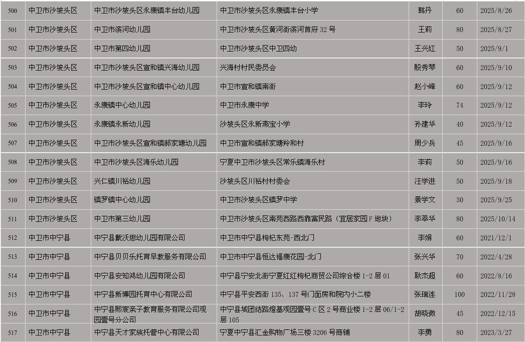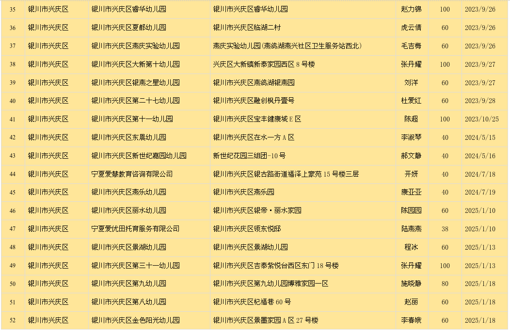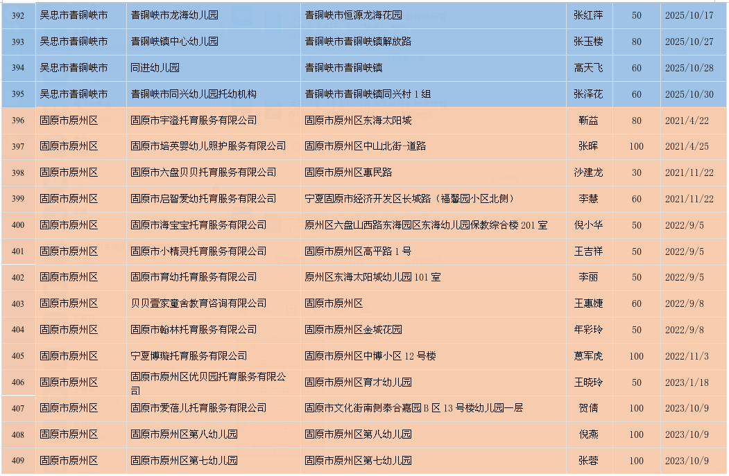为加强托育机构管理,根据《自治区健康宁夏建设领导小组关于促进3岁以下婴幼儿照护服务发展的实施意见》(宁健组发〔2020〕3号)、《关于印发宁夏回族自治区托育机构登记和备案实施细则(试行)的通知》(宁卫规发〔2022〕2号)要求,宁夏回族自治区实行3岁以下婴幼儿托育机构备案管理制度,现将机构名单及主要信息面向社会公开。