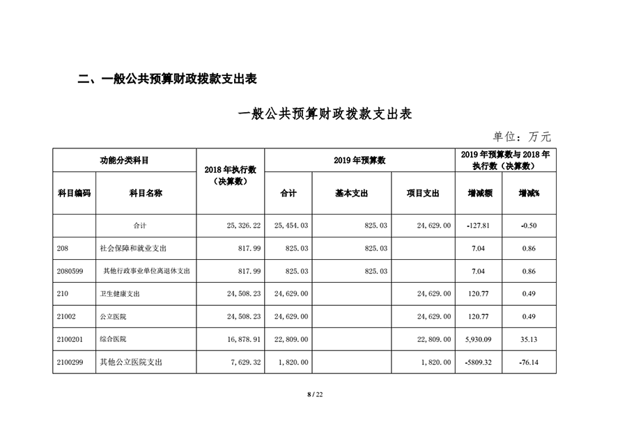 1、210卫生健康支出-02公立医院-01综合医院22,809.00万元,比2018年增加5930.09万元,增长35.13%,主要用于落实城市公立医院综合改革相关政策。