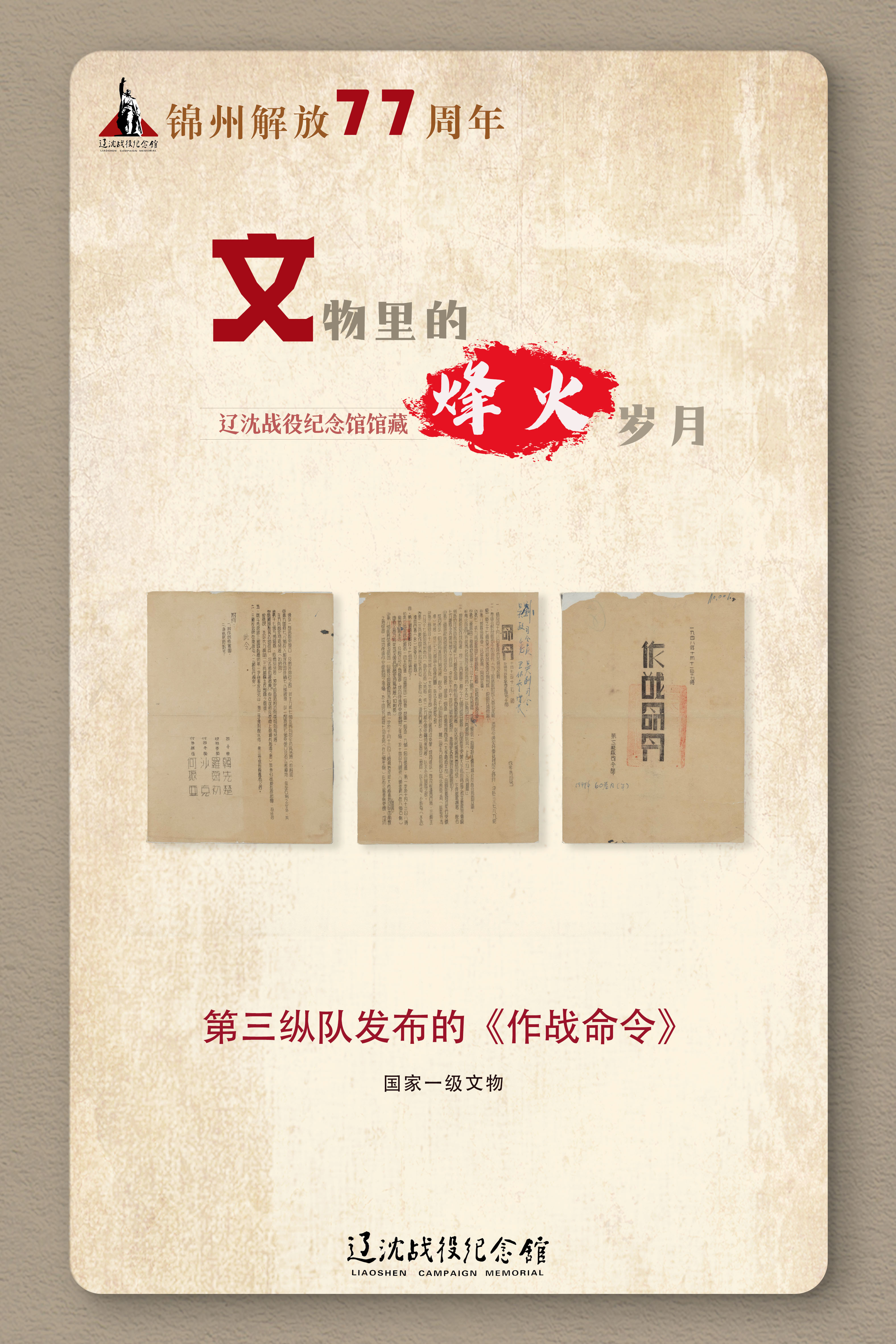 《作战命令》长30厘米,宽23厘米,纸质,字迹清晰,保存基本完好,国家一级文物,于1964年4月9日,由原部队捐赠给辽沈战役纪念馆。