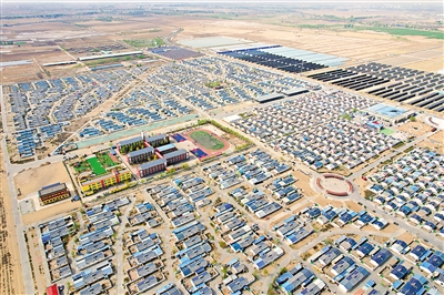 从空中俯视贺兰县洪广镇欣荣村,移民新居整齐划一。