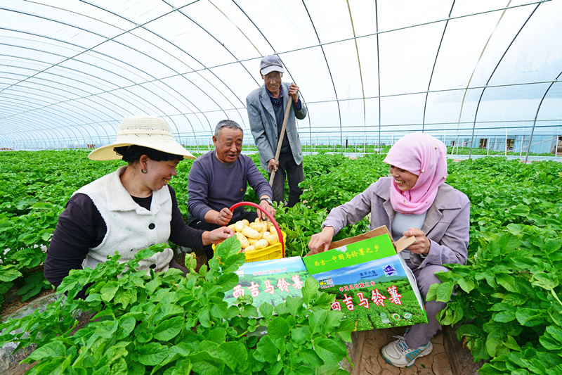 固原市西吉县马莲乡村党组织带头人妥万禄(左二)和群众采摘马铃薯。