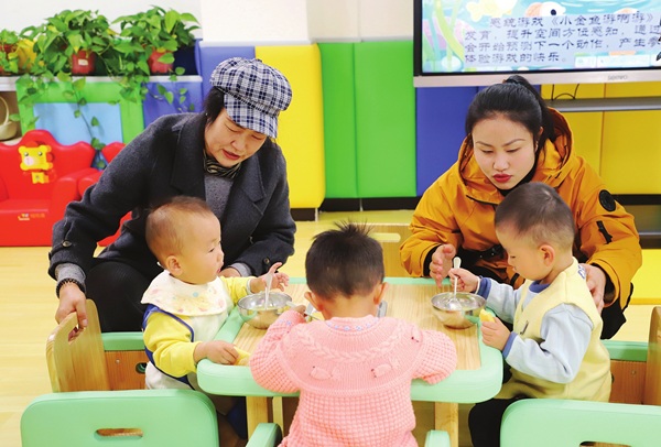 近日,宁夏回族自治区固原市彭阳县首家公办托育综合服务中心正式投入使用。该中心创新采用“教育﹢卫生健康”双专业支撑模式,规划开设1个乳儿班、2个托小班、3个托大班,共计提供100个托位。目前,首批招收的15名婴幼儿已入园。图为该中心工作人员与家长一起帮助幼儿吃午餐。