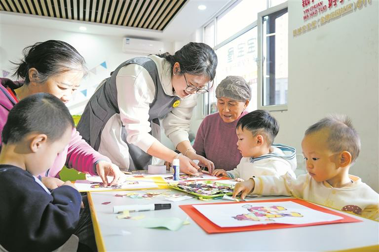 1月8日上午,在银川市金凤区黄河东路街道金地花园社区“凤城宝宝屋”,育儿老师带领小朋友做手工。作为中央财政支持的普惠托育示范项目,黄河东路街道“凤城宝宝屋”已在湖畔嘉苑西区社区、金地花园社区、新苑社区落地,构建起覆盖辖区的“15分钟就近托育婴幼儿照护服务圈”,为0—3岁婴幼儿家庭解决照护难题。宝宝屋的照护人员均持有育婴师或幼儿教师资格证,经系统培训后上岗。他们不仅提供基础生活照料,还通过游戏互动、绘本阅读等特色活动,促进婴幼儿综合能力发展。宝宝屋采用“政府补一点、机构让一点、家庭付一点”的三方分担模式,提供亲子早教课程、半日托、临时托等服务,按次收费,满足不同家庭需求。自去年3月试运营以来,3家社区宝宝屋日均服务婴幼儿15人次以上。