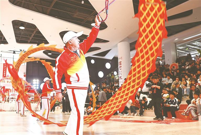 2月8日,“运动迎新春 健康启新程”2026年宁夏全民健身大拜年活动主会场在砂之船(银川)奥特莱斯启动,并与石嘴山市、吴忠市、固原市、中卫市联动,推进“商文旅农体酒”深度融合,激活假日消费,丰富群众节日生活。图为空竹舞龙项目展演。 宁夏日报报业集团全媒体记者 高晓刚 摄