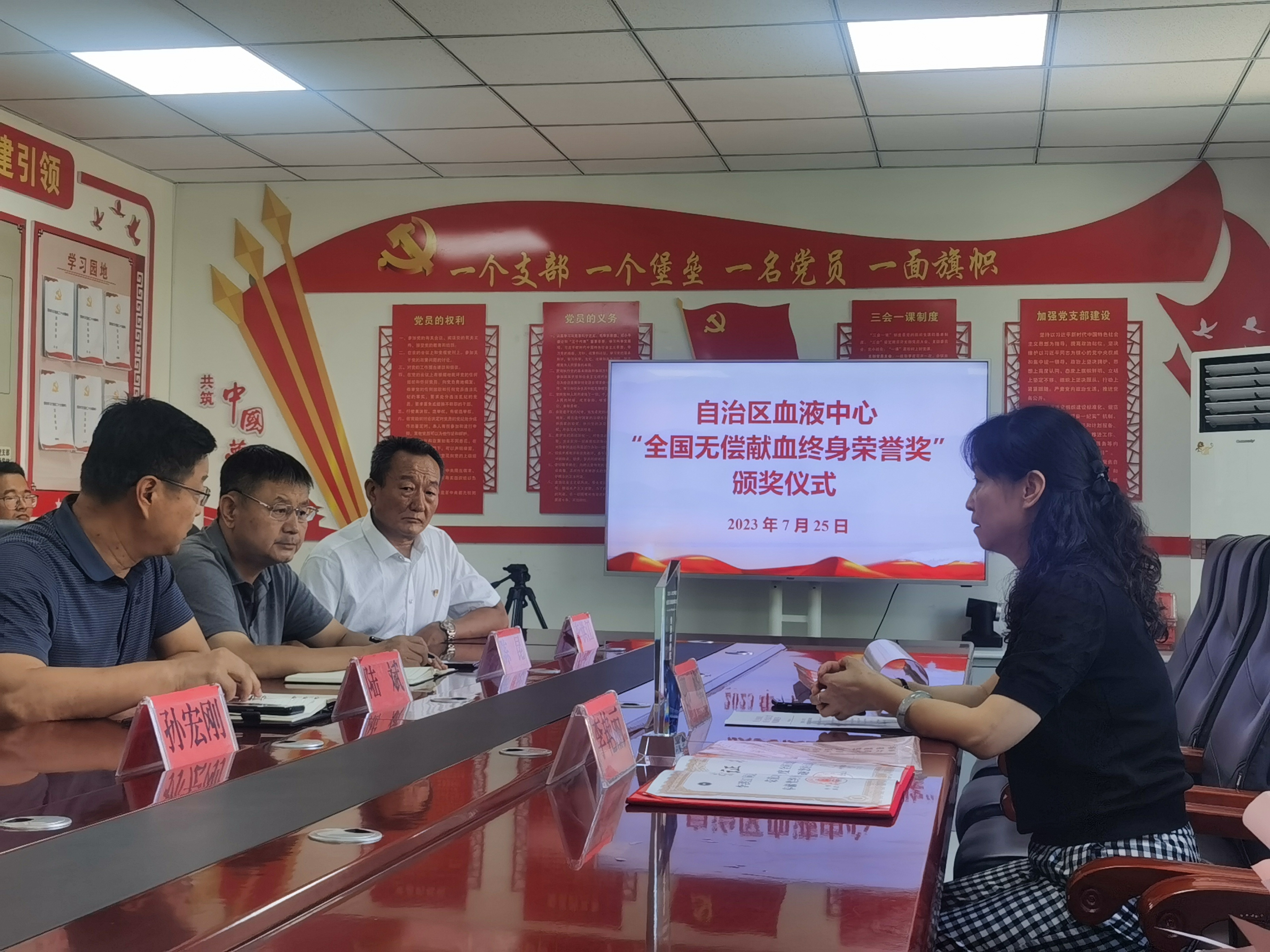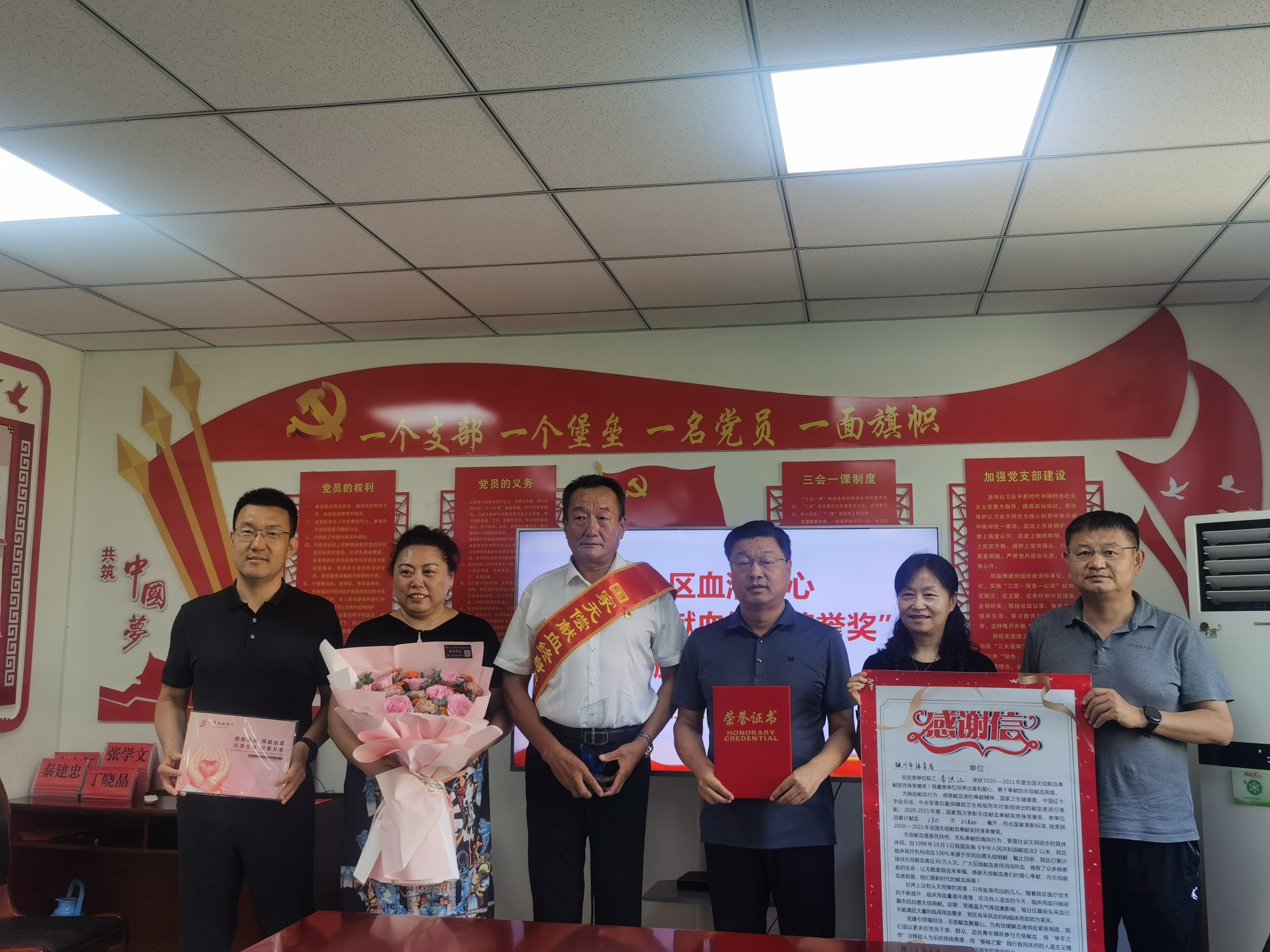 7月25日,宁夏血液中心副主任邵峰、宣传招募科副科长李艳丽一同前往银川市体育局,向该单位职工李洪江送上荣誉证书、奖杯、定制邮折及鲜花,以感谢该同志对无偿献血所做出的130次奉献。