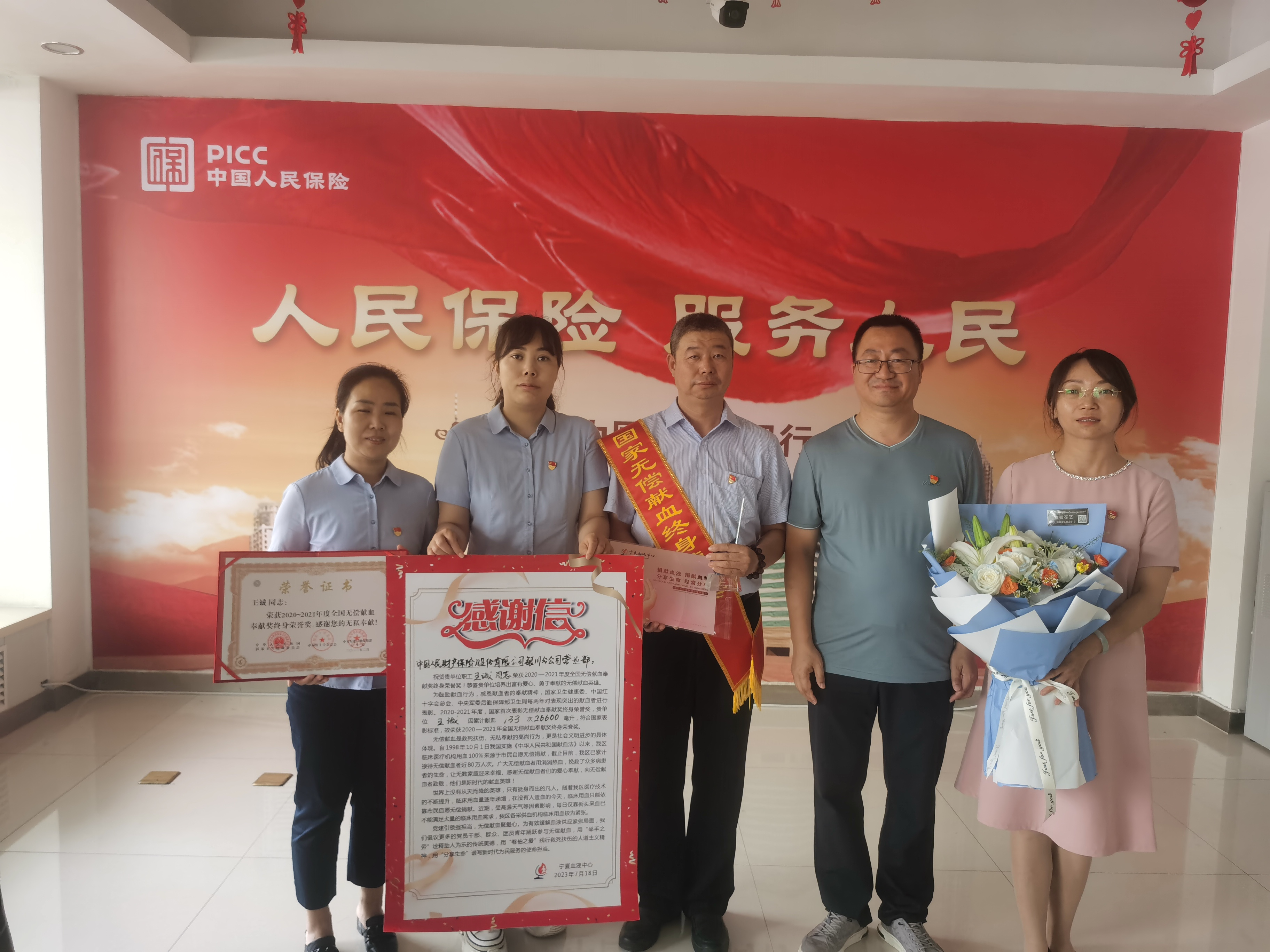7月26日,献血服务科党支部书记、科长侯志敏,献血服务科党支部宣传委员、副科长马伟一同前往中国人民财产保险股份有限公司银川公司营业部,向该单位员工王诚送上荣誉证书、奖杯、定制邮折及鲜花,以感谢该同志对无偿献血所做出的133次奉献。该公司负责人表示,将会继续开展员工献血活动,用无偿献血践行企业的社会责任。