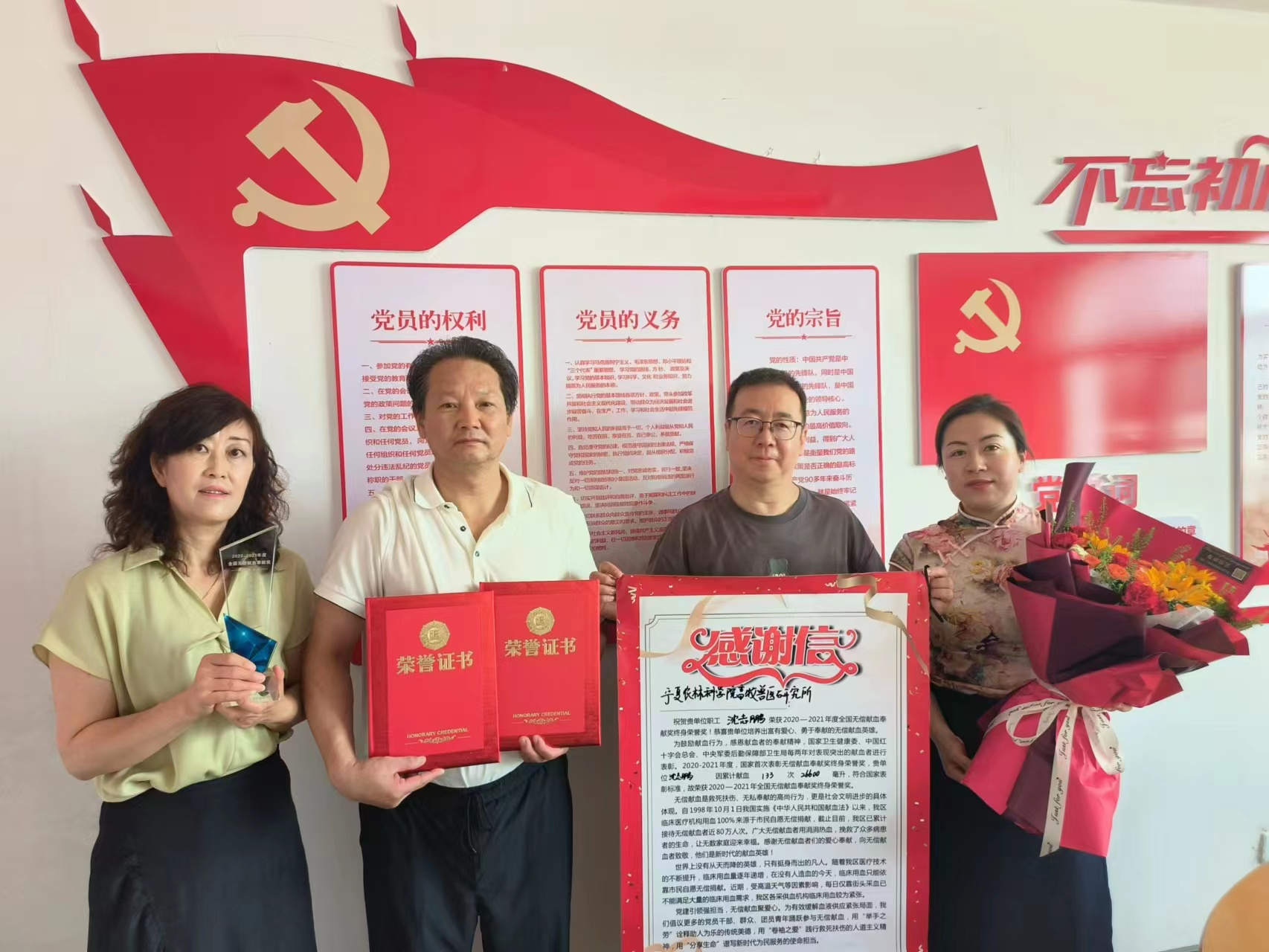 与此同时,宣传招募科党支部书记、科长韩文丽,宣传招募科党支部纪检委员杨军一同前往距离银川30多公里的宁夏农林科学院畜牧兽医研究所,向该单位职工沈志鹏送上荣誉证书、奖杯、定制邮折及鲜花,以感谢该同志对无偿献血所做出的133次奉献。该单位负责人表示,将会在单位大力宣传该同志的精神,以调动更多职工参与到无偿献血的队伍中,做出贡献。