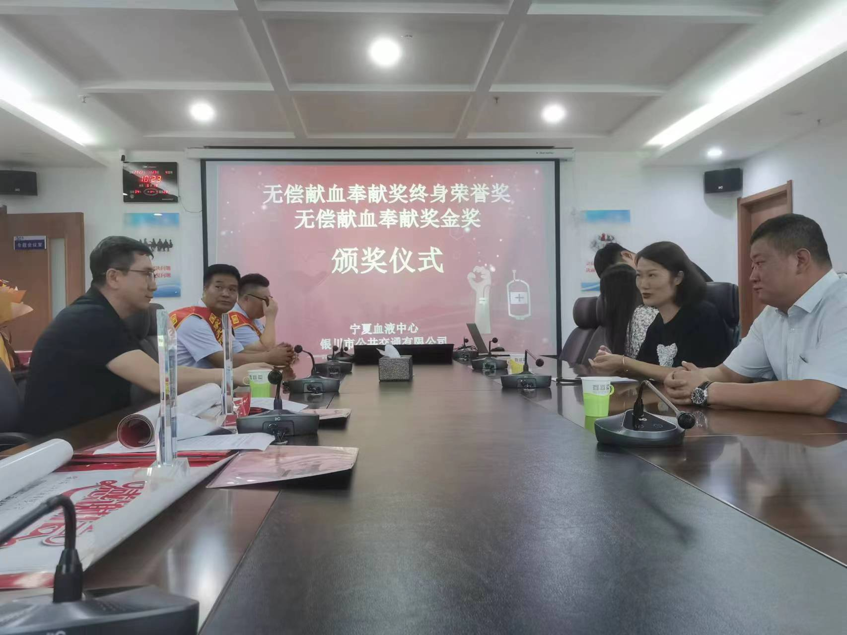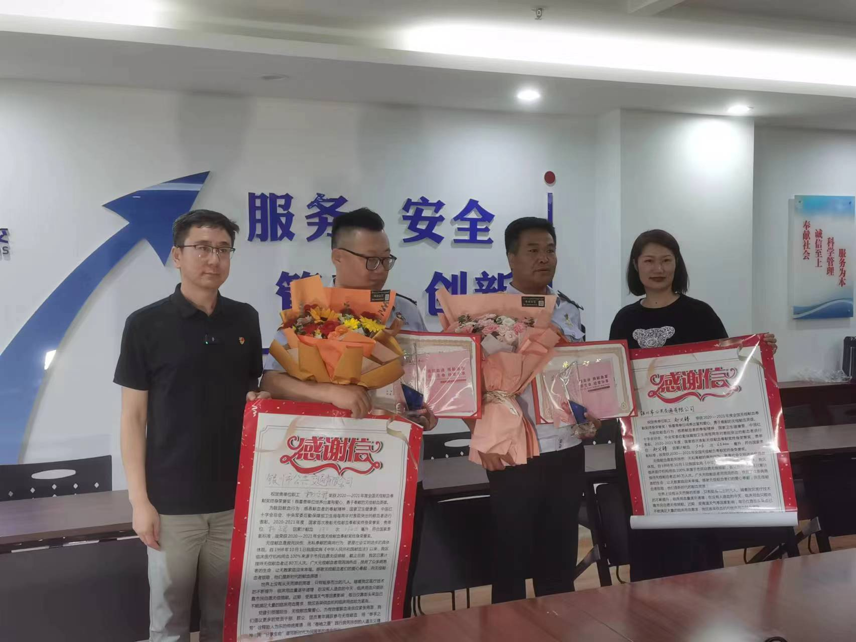 7月27日,宁夏血液中心党总支副书记、主任张伟,宣传招募科党支部书记、科长韩文丽一同前往银川市公共交通有限公司,向该公司的杨斌、赵义峰两位司机送上荣誉证书、奖杯、定制邮折及鲜花,对他们长期坚持献血的善举表示感谢。