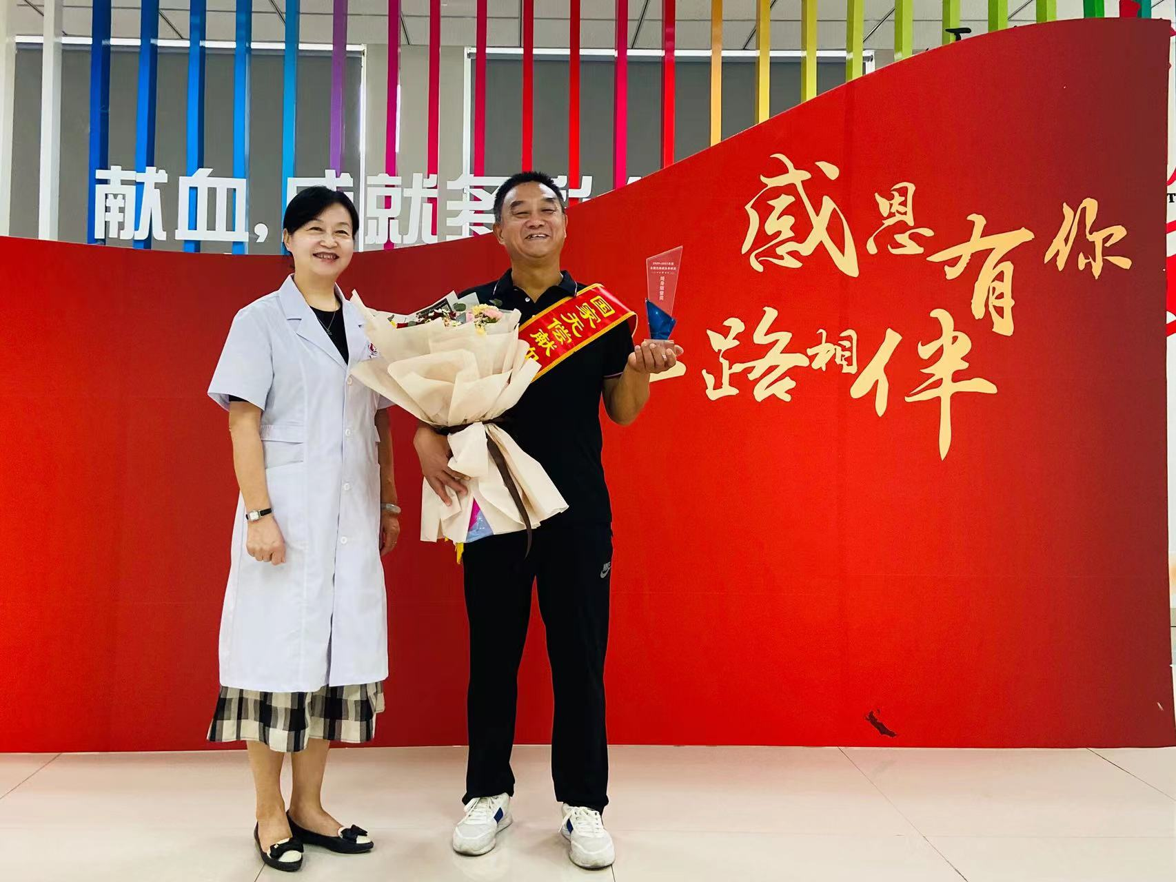 与此同时,宁夏血液中心副主任邵峰,为前来捐献血小板的无偿献血志愿服务队队长范晓东,颁发无偿献血终身荣誉奖证书及奖杯,并为他送上鲜花和特制邮折,对他为无偿献血做出的贡献、长年坚持无偿献血以及无偿献血志愿服务表示敬意与感谢。范晓东表示,自己会一直将无偿献血做到“退休”,而无偿献血志愿服务他会一直做到老。